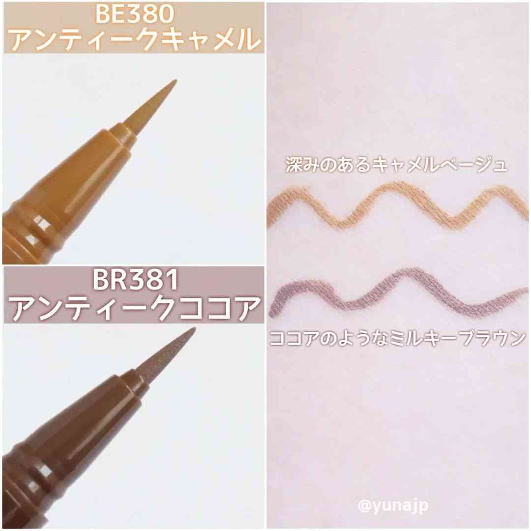 細(xì)筆頭,彈性適中,方便勾勒精致眼線(xiàn)。#BE380是深駝色,比黑色和棕色顏色更淺,呈現(xiàn)出來(lái)的眼妝柔和自然、