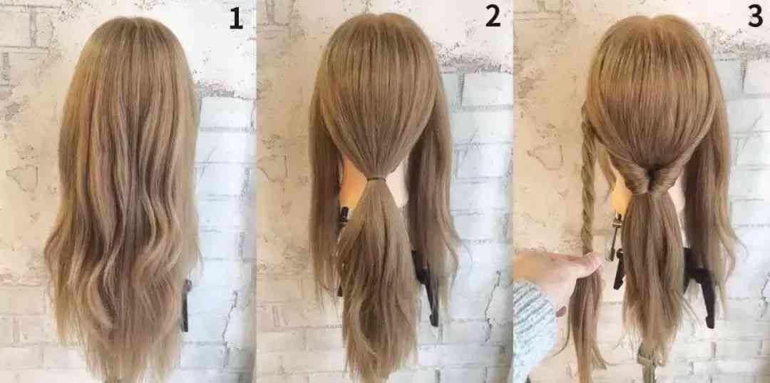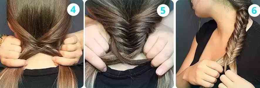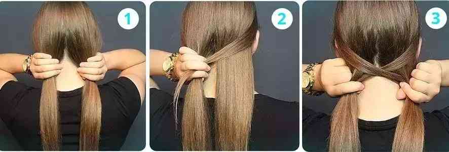 step1&2&3:先將頭發(fā)分成兩半,從兩邊頭發(fā)中抽出一小撮,交叉歸到另一邊的頭發(fā)中;