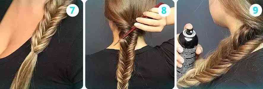 step7&8&9:用發(fā)圈扎起發(fā)尾固定,再用尖頭梳子將頭發(fā)弄蓬松,最后用定型噴霧固定一下。