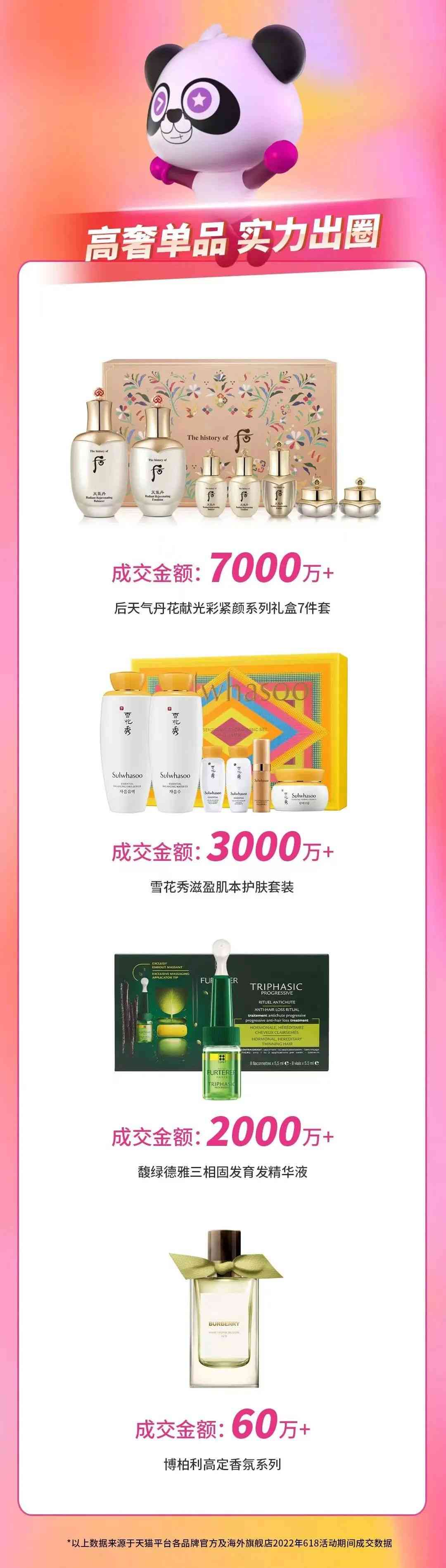 其中,后天氣丹花獻光彩緊顏系列禮盒7件套成交額超7000萬,雪花秀滋盈肌本護膚套裝成交額超3000萬,馥綠德雅三相固發(fā)育發(fā)精華液成交額超2000萬,博柏利高定香氛系列成交額超60萬。