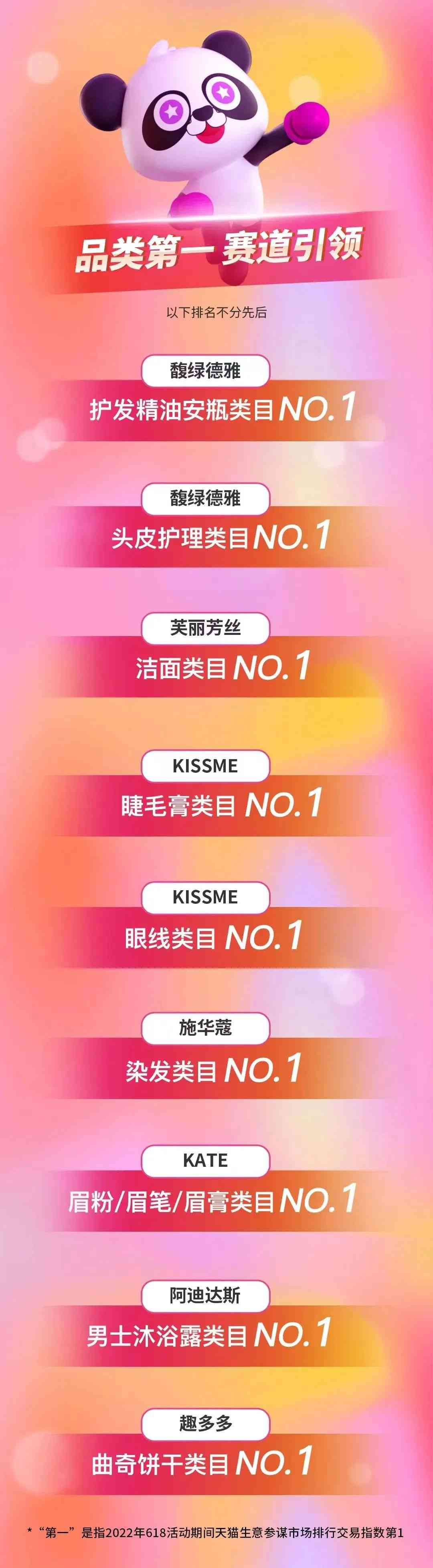 在品類方面,馥綠德雅、芙麗芳絲、KISSME、施華蔻、KATE、阿迪達斯等多個品牌,分別攬獲護發(fā)精油安瓶類目、頭皮護理類目、潔面類目、睫毛膏類目、眼線類目、染發(fā)類目、眉粉/眉筆/眉膏類目、男士沐浴露等多個細分品類。