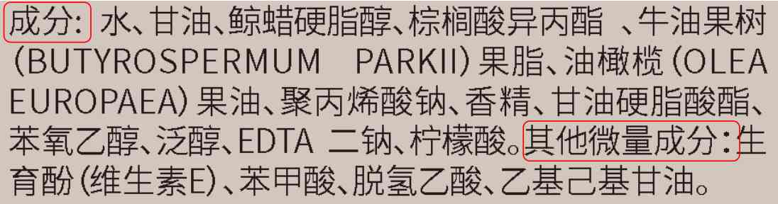 1)在銷售包裝可視面標注化妝品全部成分的原料標準中文名稱,以“成分”作為引導語引出,并按照各成分在產(chǎn)品配方中含量的降序列出。配方中存在含量不超過0.1%(w/w)的成分的,所有不超過0.1%(w/w)的成分應當以“其他微量成分”作為引導語引出另行標注,可以不按照成分含量的降序列出。