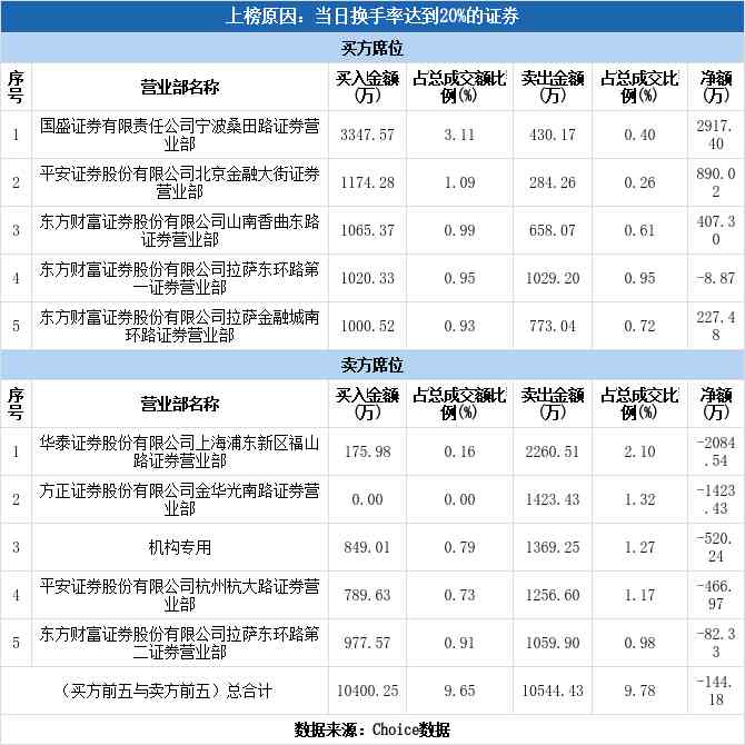 賣五為東方財(cái)富證券拉薩東環(huán)路第二證券營業(yè)部,該席位買入977.57萬元,賣出1059.90萬元,凈買額為-82.33萬元。近三個(gè)月內(nèi)該席位共上榜788次,實(shí)力排名第7。東方財(cái)富證券拉薩東環(huán)路第二證券營業(yè)部今日還參與了曲江文旅(凈買額-2106.94萬元),西安旅游(凈買額808.02萬元),鵬鼎控股(凈買額-709.06萬元)等14只個(gè)股。