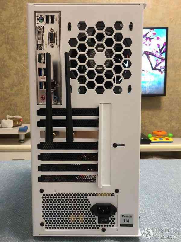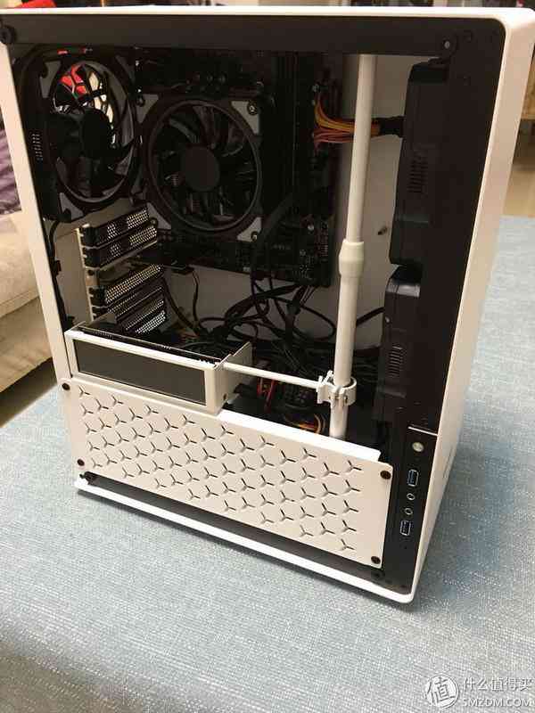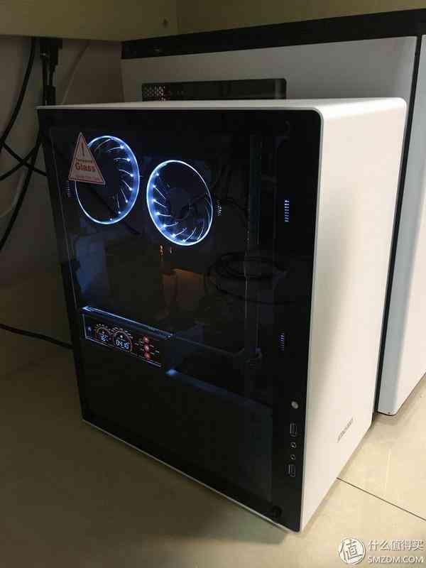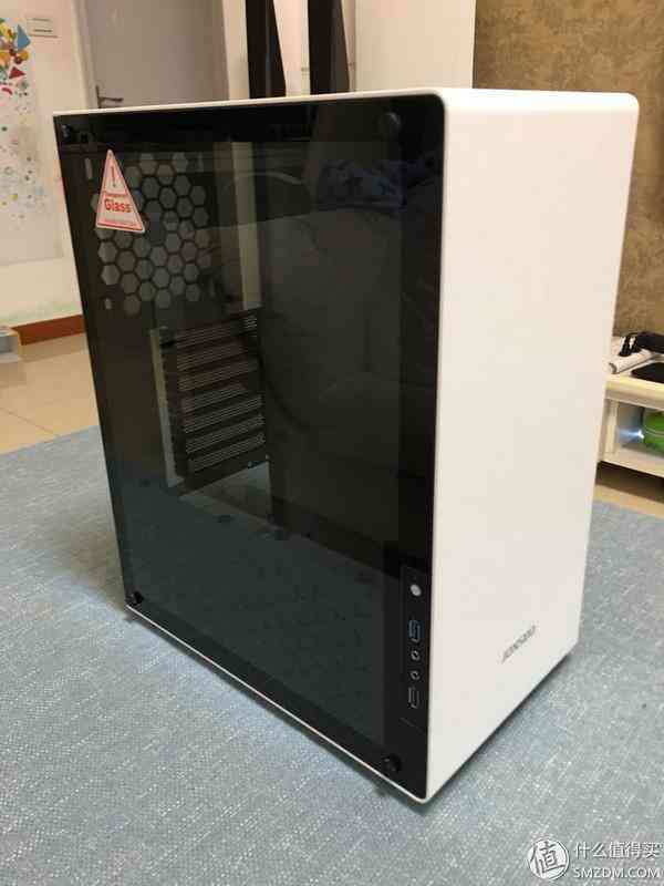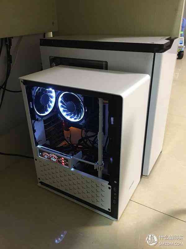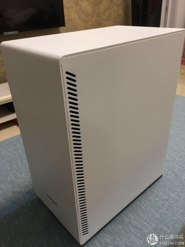 可以看到和小白的H440機箱比還是小了很多,但也實在算不上小,離ITX確實還有一定距離。。這個機箱我還是蠻滿意的,原因有二:1. 岳父家的房門在機箱左邊,屏幕和鍵盤在機箱右邊,這個機箱是一個左透,那么進門的人一下就可以看到渦輪炫光,而岳父母坐在右邊使用電腦時不會被光污染打擾;2. 價格合適,做工用料足,顏色也好看,純白的沒有一絲雜質(zhì)