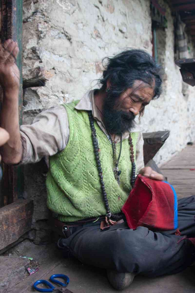 關(guān)于鞋子,洛堅(jiān)老人保存著他年輕時(shí)穿過的一雙,鞋底穿壞了,只剩上面的部分。鞋面用紅色的呢布制成,有白色的線條點(diǎn)綴出簡(jiǎn)單的圖案;鞋腰高約二十厘米,為素色的白呢布。這鞋子配上牛絨繩納成的鞋底或牛皮底,就是藏族常見的松巴鞋——長(zhǎng)筒藏靴。已過世的邊巴喇嘛曾經(jīng)是偉薩確林寺的主管,平時(shí)頭戴老式的瓜皮帽,梳著尾梢纏有紅繩的長(zhǎng)辮子,脖子上掛著念珠,明黃色的襯衣外套著油亮油亮的紅色抓絨夾克。雖然他年近八十,但不論天晴或是刮風(fēng)下雨,始終光著一雙大腳。對(duì)于自幼就赤腳上山下地的他,已經(jīng)不習(xí)慣鞋子給雙腳帶來的束縛。