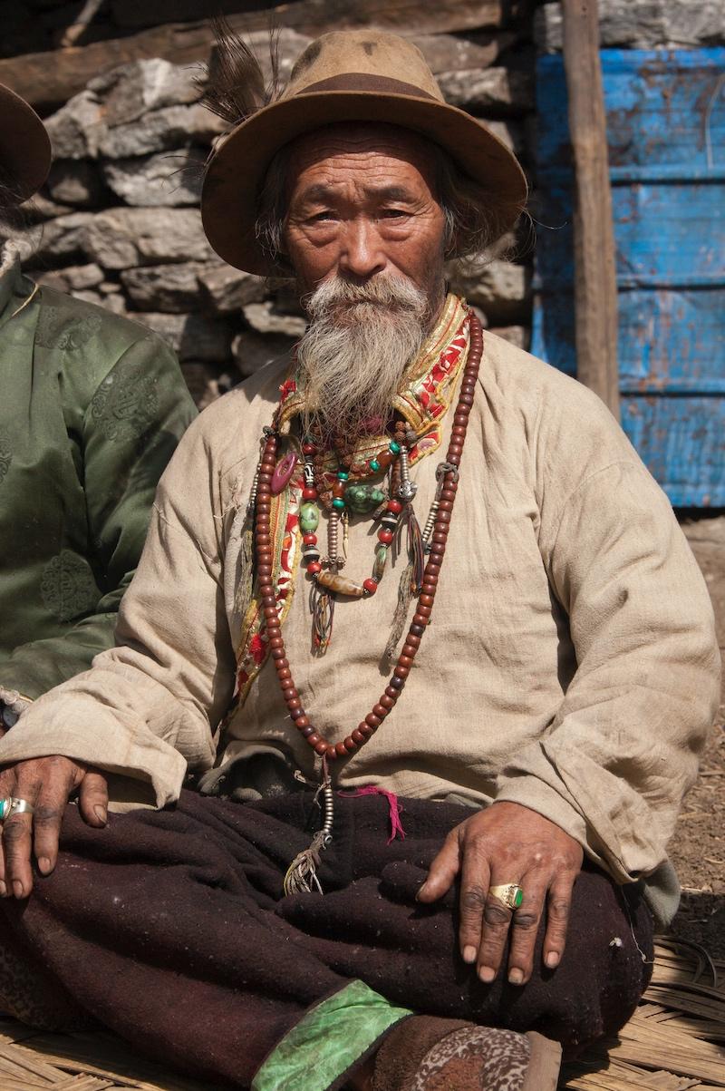 除了腰佩棋刀,相對(duì)于婦女還能保存著相對(duì)原生態(tài)的服飾,男性夏爾巴就沒有那么幸運(yùn)了。制帽師多吉平措平時(shí)都穿著漢式服裝,梳著一個(gè)大辮子,戴側(cè)插著花朵的灰黃色呢絨帽——若從服飾上看,較漢族并無特別之處。老鎮(zhèn)長(zhǎng)拉加脖子上掛著綠松石、紅瑚珊與瑪瑙珠配成的掛飾及法師的護(hù)身符;手上戴著粗大的尼泊爾鑲寶石戒指;長(zhǎng)發(fā)梳成一條長(zhǎng)辮,頭頂左側(cè)戴著插著花朵的氈帽。他2009年在尼泊爾訂做了一套上裝,與以前的服裝特別相似,由立領(lǐng)斜襟右衽棉麻材質(zhì)的藏式襯衫與對(duì)襟無領(lǐng)無扣的牦牛絨長(zhǎng)坎肩組成,襯衫的立領(lǐng)與長(zhǎng)坎肩的周邊都縫有綢緞的邊飾,顯得華貴。