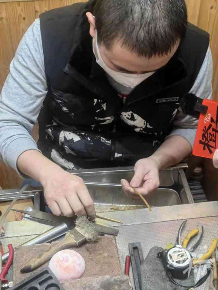 東山珠寶也屬于典型的夫妻店,顏師傅25歲就開始學(xué)打金,91年和老婆方姐在浙大邊開了這家東山珠寶,到目前已經(jīng)有30多年了,店里大部份的打金業(yè)務(wù)都由顏師傅“承包”。