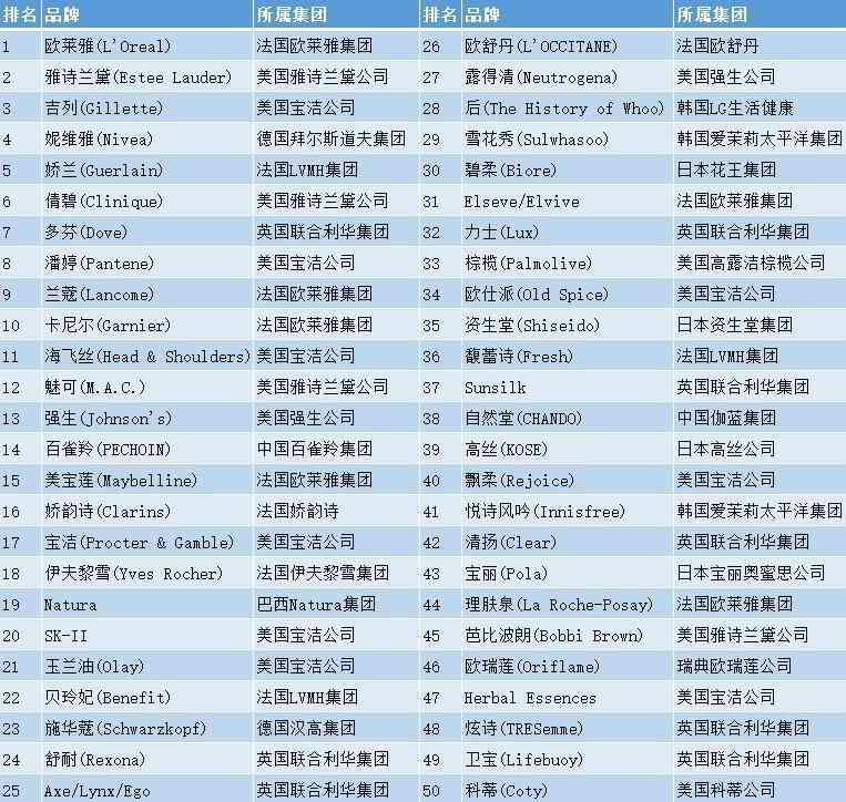 全球四大日化巨頭之一的美國寶潔公司是上榜品牌數(shù)量最多的集團,共計9個,包括潘婷(8)、海飛絲(11)、SK-II(20)、玉蘭油(21)、飄柔(40)等耳熟能詳?shù)钠放?。?lián)合利華集團則有多芬(7)、舒耐(24)、力士(32)、清揚(42)等8個品牌入圍。