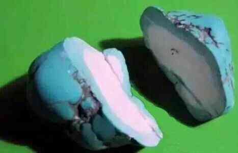 (2)再造綠松石:又稱“壓制綠松石”,是用綠松石微粒和藍(lán)色粉末狀的材料在一定的壓力和溫度下壓結(jié)而成的,其中含有微量的綠松石,一般的辨別方法很難分辨,但是還是可以通過(guò)這些方法來(lái)辨別: