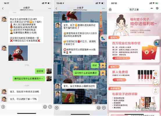 同時,完美日記還建立了幾百個(小完子)個人號,這些微信客戶號以完美日記品牌形象為IP,通過真人運營,在完成服務(wù)的同時,對用戶進行分層、滲透、復(fù)購、轉(zhuǎn)化。