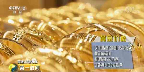 從5月開始,國際金價連續(xù)上漲。以深圳某黃金珠寶門店為例,黃金首飾金價從5月3日的每克355元,漲到6月21日的每克397元。