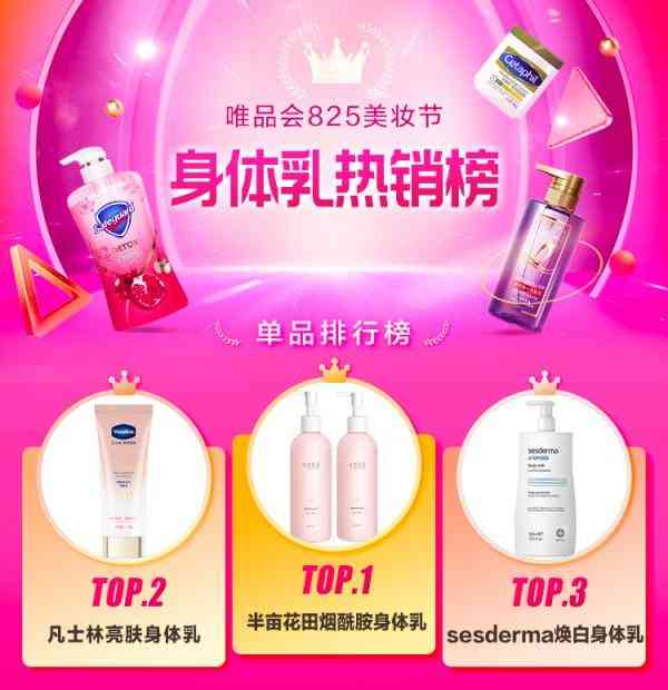 在“唯品會(huì)身體乳熱銷榜”中,中國(guó)本土品牌半畝花田的煙酰胺櫻花身體乳一舉奪得榜首,該款產(chǎn)品在8月銷量增速顯著。老牌凡士林、西班牙藥妝品牌sesderma也同樣推出了含有美白成分的熱銷產(chǎn)品,凡士林煙酰胺高光身體乳、sesderma煥白身體乳分別占據(jù)榜單二、三名。