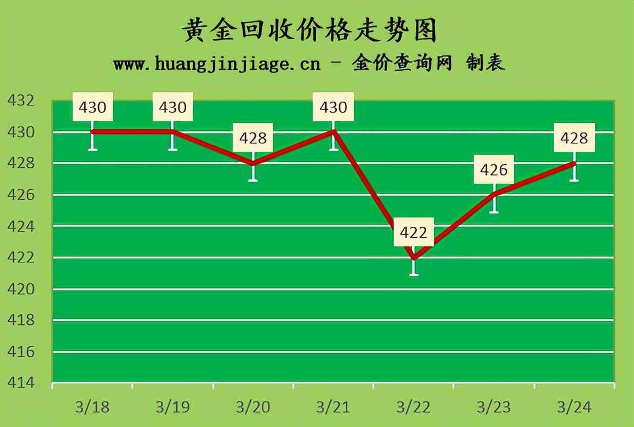 黃金回收價格428元/克,鉑金回收價格190元/克,鈀金回收價格290元/克,18K金回收價格306元/克,銀條回收價格3.6元/克。(黃金行情是波動的,回收金價沒有固定標準。)