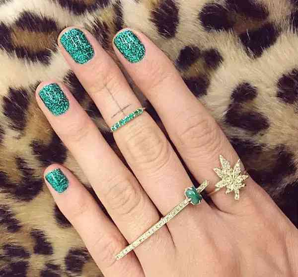 綠色在各類寶石中也相當(dāng)主流,如圖選擇有亮片效果的甲油簡(jiǎn)直和珠寶的閃耀一脈相承,美得很高級(jí)感。