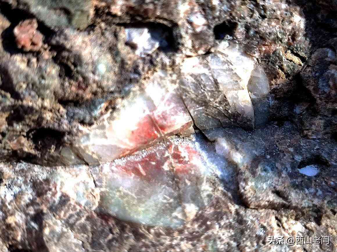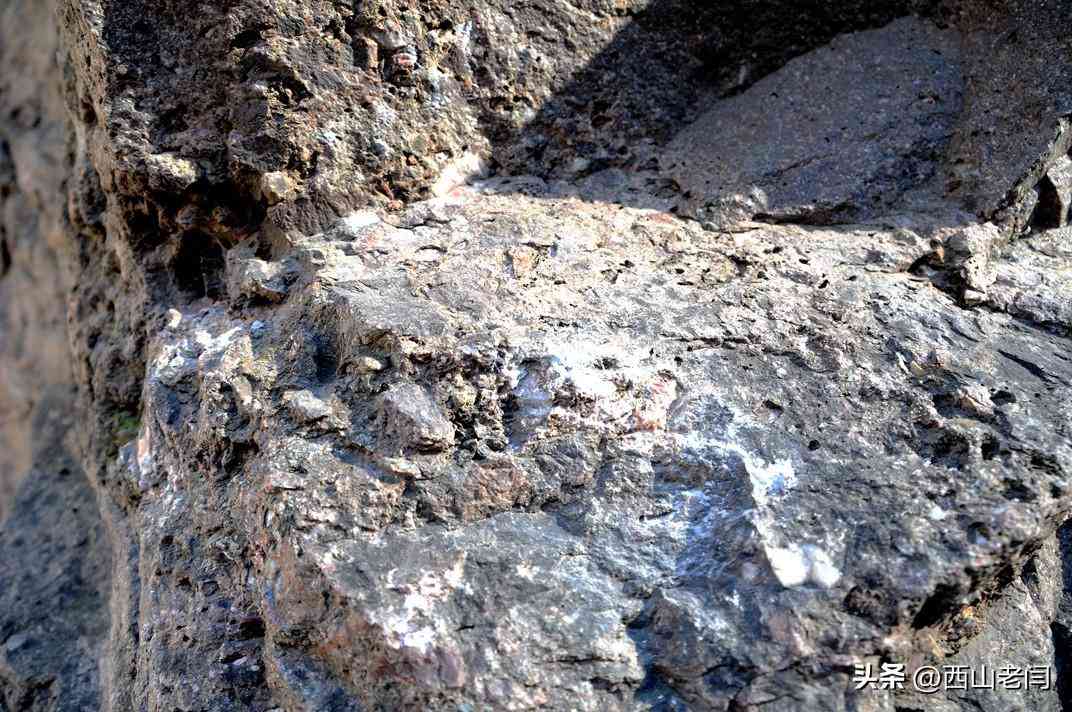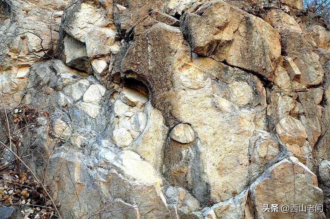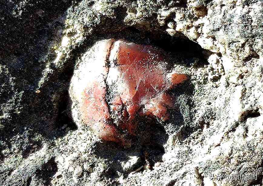 按照標(biāo)牌介紹所說在巖石上細(xì)看,巖石中的確夾雜著瑪瑙石。一般人是不會(huì)那么細(xì)致地觀察,這便是行家和外行的區(qū)別。