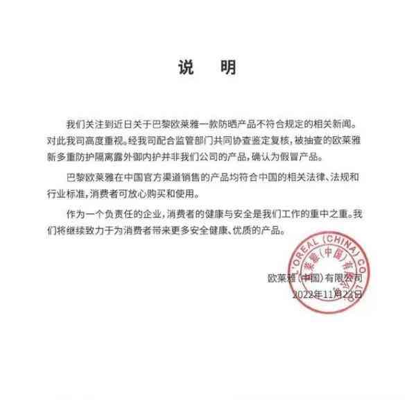 11月23日22:04,巴黎歐萊雅官方微博發(fā)布歐萊雅(中國)有限公司聲明稱:“關注到近日關于巴黎歐萊雅一款防曬產(chǎn)品不符合規(guī)定的相關新聞。