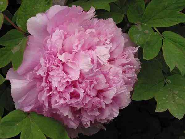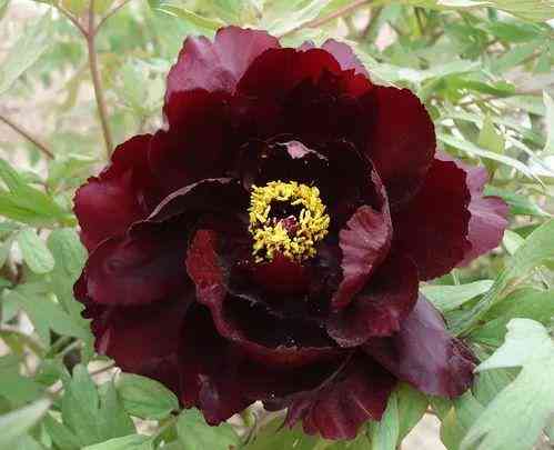 花墨色,荷花型或菊花型,中凸黃蕊,瓣稍往內(nèi)卷。葉中圓,葉梗紫紅。屬傳統(tǒng)名花。