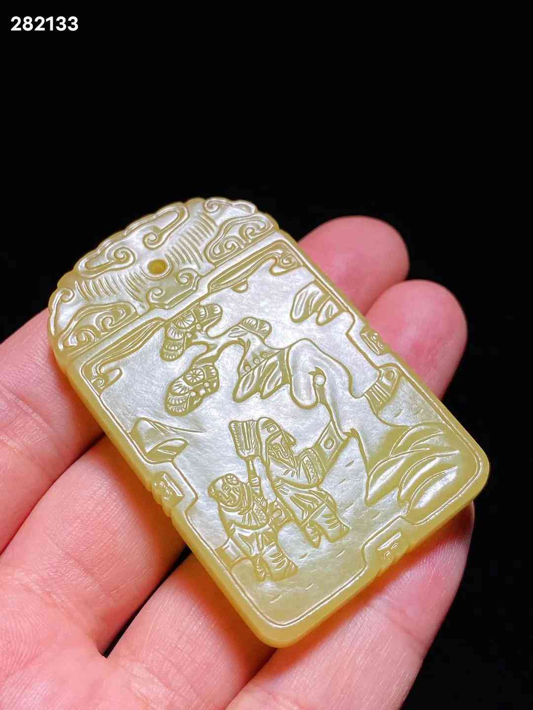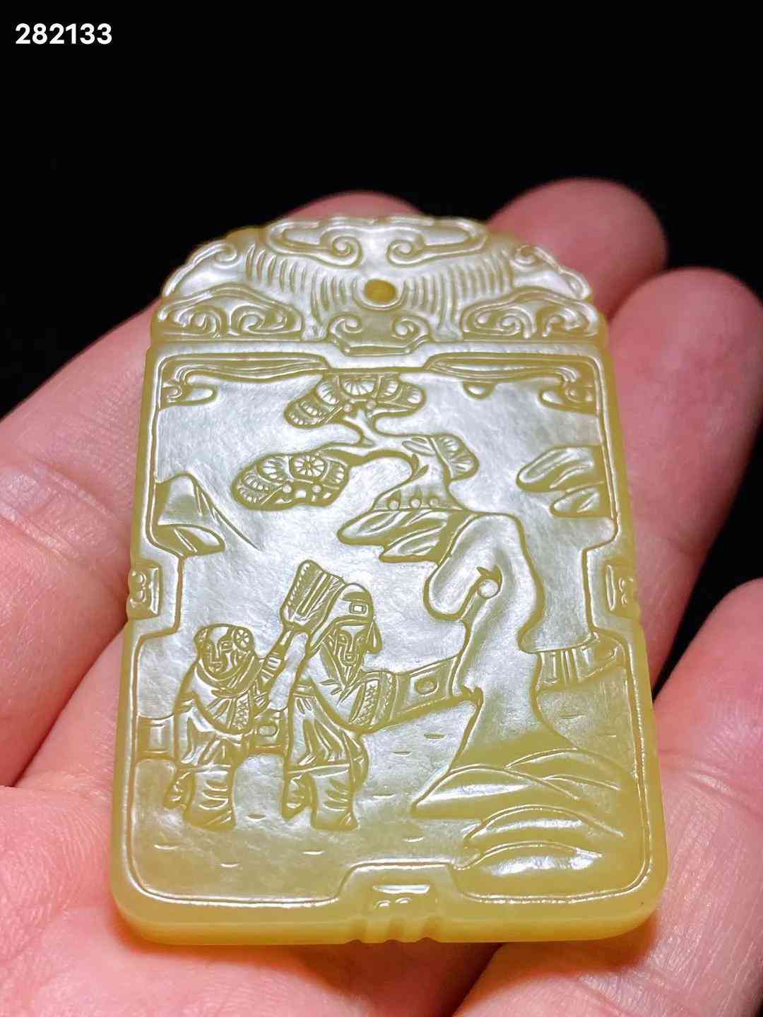 清中期 和田玉籽料 黃玉 米芾拜石 詩文牌 子岡牌 長3.8 寬0.7 高6.1厘米 重42.3克 牌取上好黃玉料琢制而成,色黃且正,柔和如脂。黃玉因其稀有罕見,產量很少,珍貴更甚羊脂白玉。牌首雕如意云紋,剔地陽起雕米芾拜石圖,流云滿天,古松遒勁,曲水之間,亭欄之內,米芾正躬身稽首,拜伏洞石,侍童執(zhí)涼扇立于其后。構圖舒朗,碾磨俐落,雖為淺浮雕,然溝壑之中過渡精細,更有圓雕逼真之趣,人物衣紋、髯發(fā)細入毫微,展現(xiàn)了制玉工匠精湛的藝術功力。玉牌背面開光內刻陽文行書詩句“吾愛孟夫子,風流天下聞。紅顏棄軒冕,白首臥松云。”,落“子岡”二字款。米芾是北宋著名書畫家,他一生博雅好石,精于鑒賞,對奇石的喜愛簡直如癡如癲,毫無顧忌?!该总腊菔故枪糯奈娜说涔?,始傳已久,清代玉雕中常見此題材。