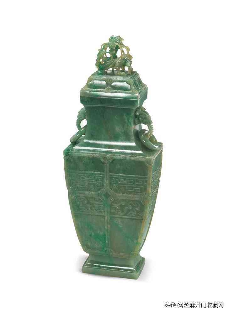清中期翠雕獸面雙耳蓋瓶,尺寸:直徑3.8厘米,估價:RMB 5,000,000,成交價: RMB 4,368,000