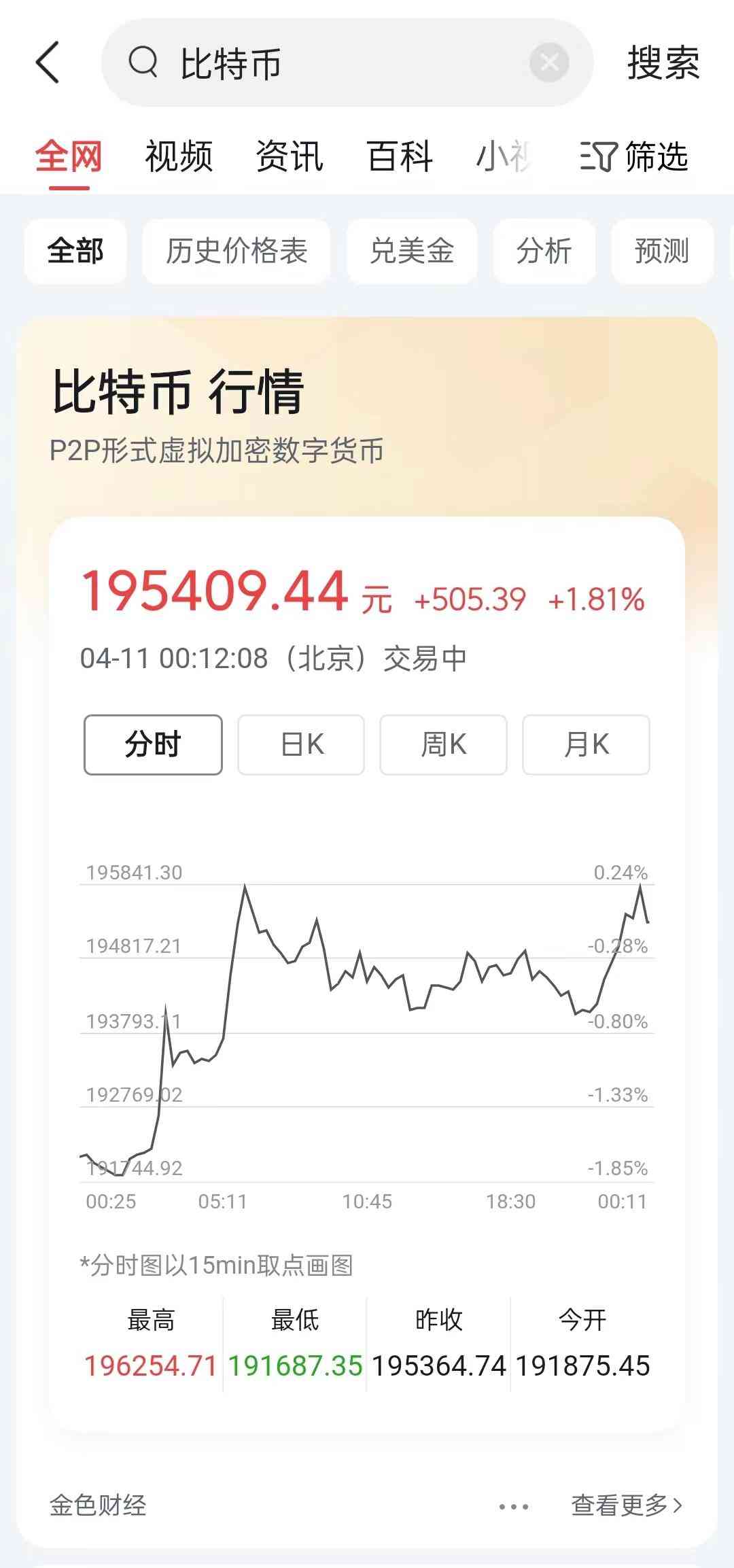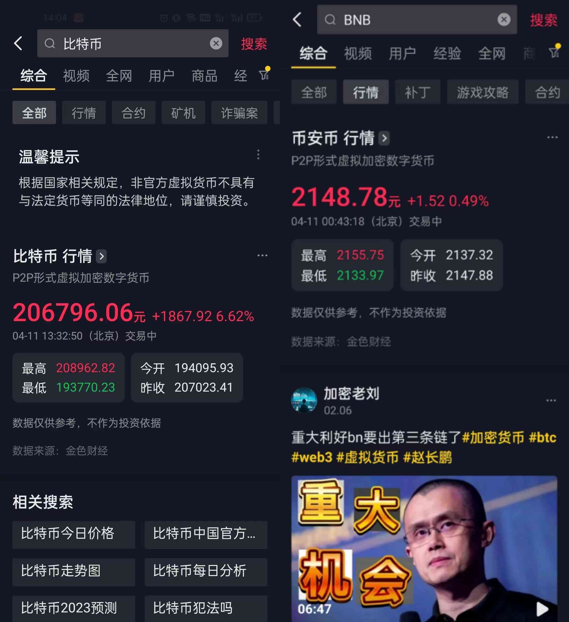 抖音APP內搜索后可顯示比特幣、以太坊、萊特幣、瑞波幣等個別主流虛擬貨幣的行情,甚至還有全球最大虛擬貨幣交易所Binance推出的平臺幣(BNB),并且為人民幣計價。抖音顯示數據來源為金色財經,其為一區(qū)塊鏈垂直資訊平臺。同一時間觀察者網在今日頭條APP搜索發(fā)現,平臺內也可實現比特幣價格的查詢。