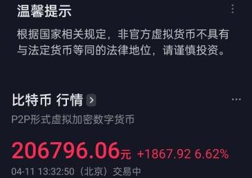 觀察者網發(fā)現,相較昨晚,今日下午抖音APP內顯示的比特幣行情上方多了一個提示:根據國家相關規(guī)定,非官方虛擬貨幣不具有與法定貨幣等同的法律地位,請謹慎投資。