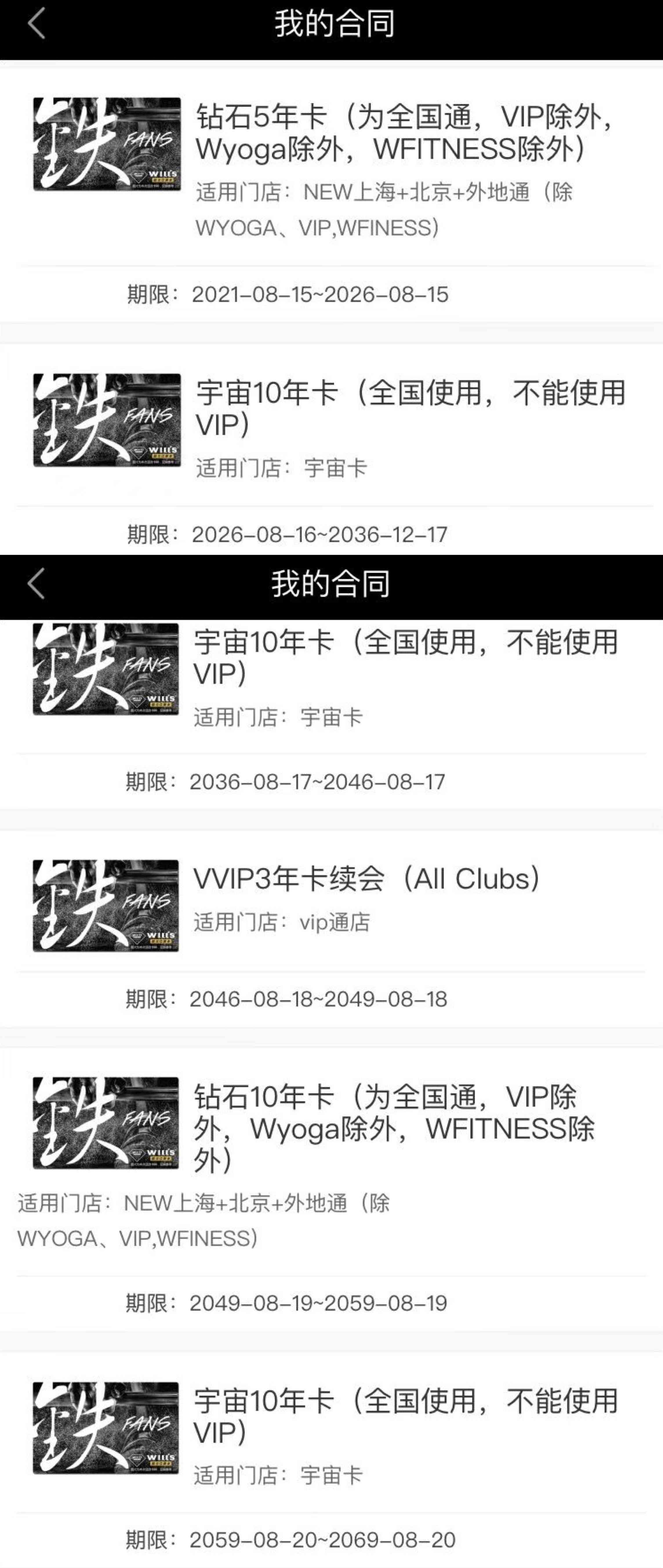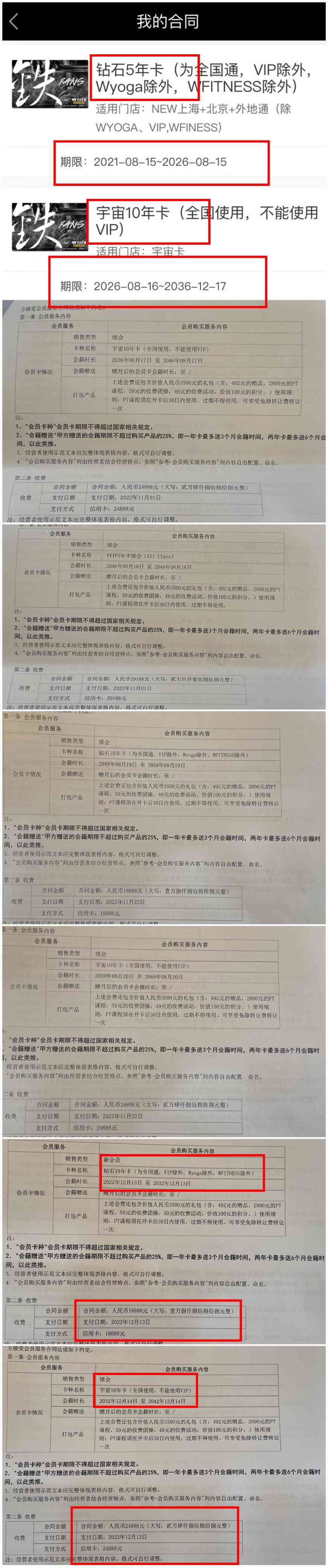 我還發(fā)覺,在尚海酈景店超年齡辦的兩張10年卡,兩份合同上顯示的會籍時長居然是從2022年12月至2042年12月——和我此前購買的會籍卡年限重疊。在威爾仕健身的官方App個人頁面,也唯獨不顯示這兩份合同。