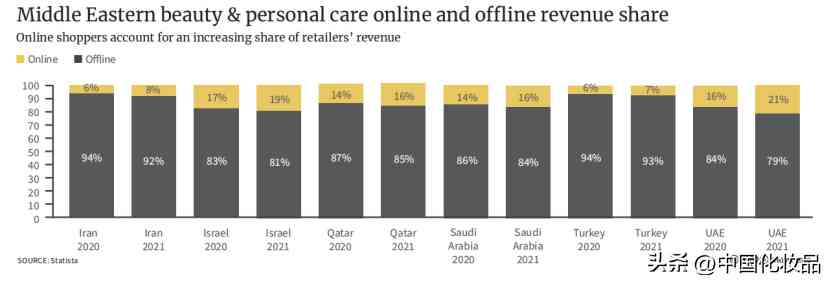 銷售渠道方面,中東地區(qū)的美妝市場,目前依舊以線下為絕對主力。2021年,卡塔爾美容個護線下渠道占比為85%,線上渠道僅占15%;沙特線下渠道占比84%,線上渠道僅占16%。