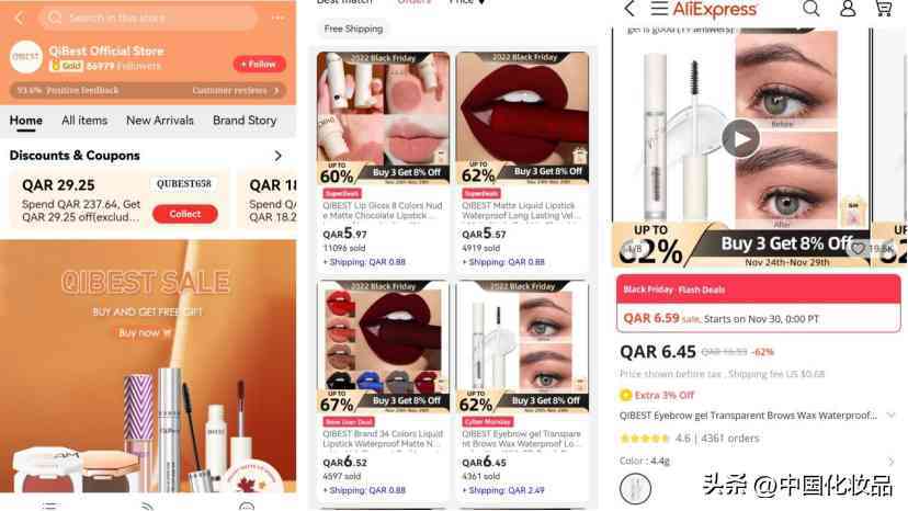 如速賣通卡塔爾地區(qū)銷量靠前的彩妝品牌QIBEST,門店粉絲數86979人覆蓋品類包括睫毛膏、腮紅、口紅等。在速賣通上,QIBEST一支睫毛膏售價6.45卡塔爾里亞爾,折合人民幣僅需要12.6元;一支口紅折合人民幣11.67元,但銷量過萬。再以中國出海化妝品牌菲鹿兒為例,其唇膏、粉餅定價也在30人民幣以內。