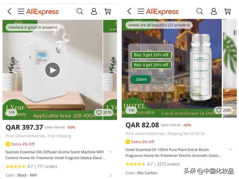 為避開這一市場差異,且獲得更高的產品溢價,一些品牌選擇從香薰機等家用儀器入手。比如香薰機品牌NAMSTE,在速賣通上一臺香薰機售價超770人民幣,而配套的一瓶香薰精油,售價則超160人民幣。