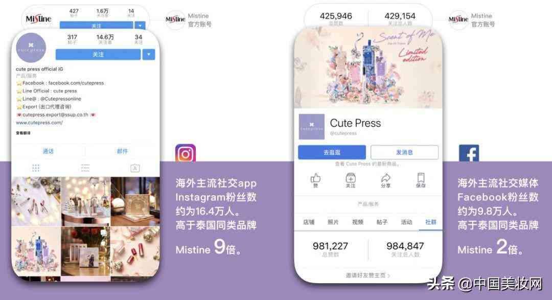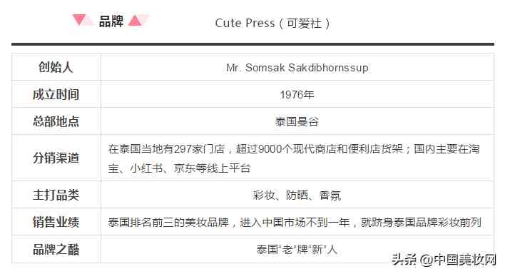 此外,Cute Press在海內(nèi)外頗具人氣。在泰國(guó),擁有超過(guò)297家直營(yíng)店,200家貿(mào)易商和連鎖銷售點(diǎn),9000個(gè)現(xiàn)代商店和便利店貨架,是泰國(guó)排名前三的美妝品牌。