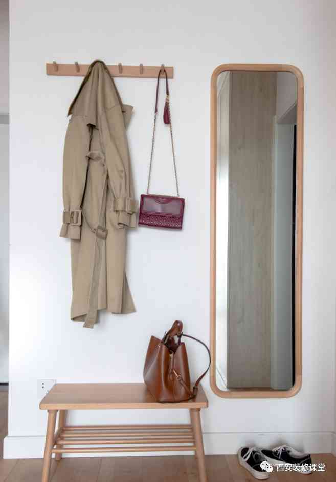 ▲戶型限制門口無法實(shí)現(xiàn)鞋柜的基本收納,只能采用簡易換鞋凳,上下層板的形式,滿足兩人常穿鞋子的放置;同時(shí)全身鏡與掛衣鉤布局,滿足進(jìn)門掛包包衣服的需求;原木風(fēng)的統(tǒng)一搭配,做到簡單有個(gè)性