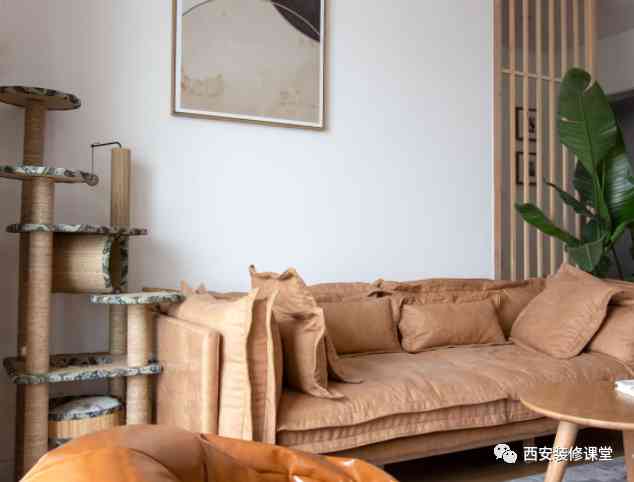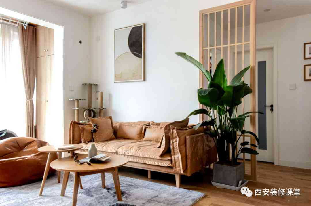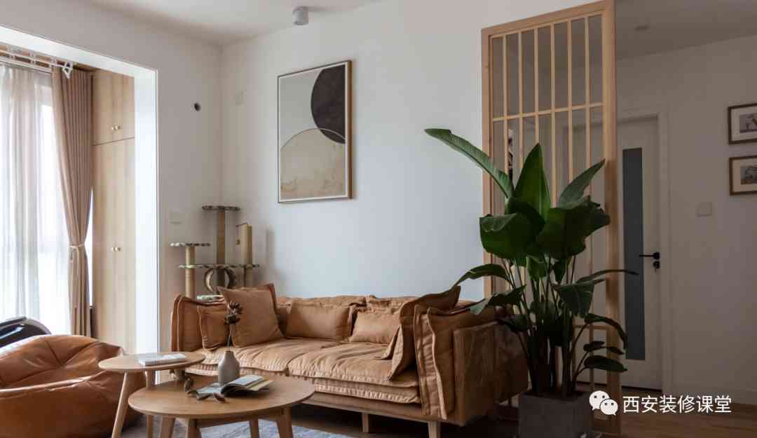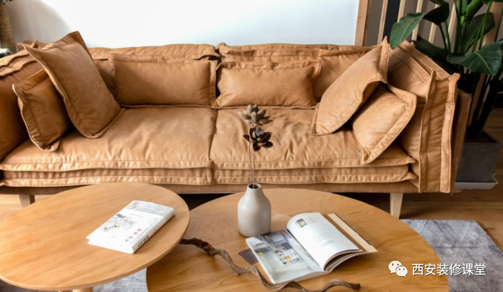 ▲棕色的科技布沙發(fā)以及懶人沙發(fā),與木質(zhì)的色調(diào)完全融合協(xié)調(diào),雙圓幾的輕巧搭配讓小空間更寬敞,更時(shí)尚;背景一副莫蘭迪風(fēng)格的掛畫簡單溫馨