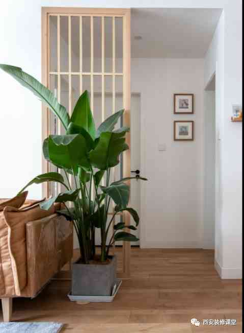 ▲打掉多余墻體,拓展進(jìn)入臥室的過道,同時(shí)木質(zhì)隔斷讓原木元素更豐富,綠植與隔斷朦朧美恰到好處;背后的衛(wèi)生間墻面兩幅精致掛畫點(diǎn)綴,溫馨柔美