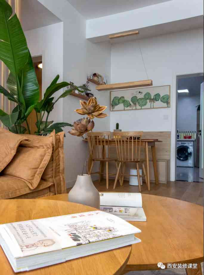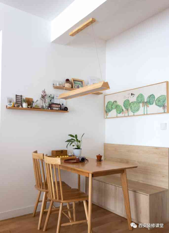 ▲進(jìn)門直對(duì)的就是廚房門口,很小的空間想要滿足就餐功能,剛好采用定制卡座的形式,搭配原木餐桌椅,既滿足功能,同時(shí)風(fēng)格更統(tǒng)一