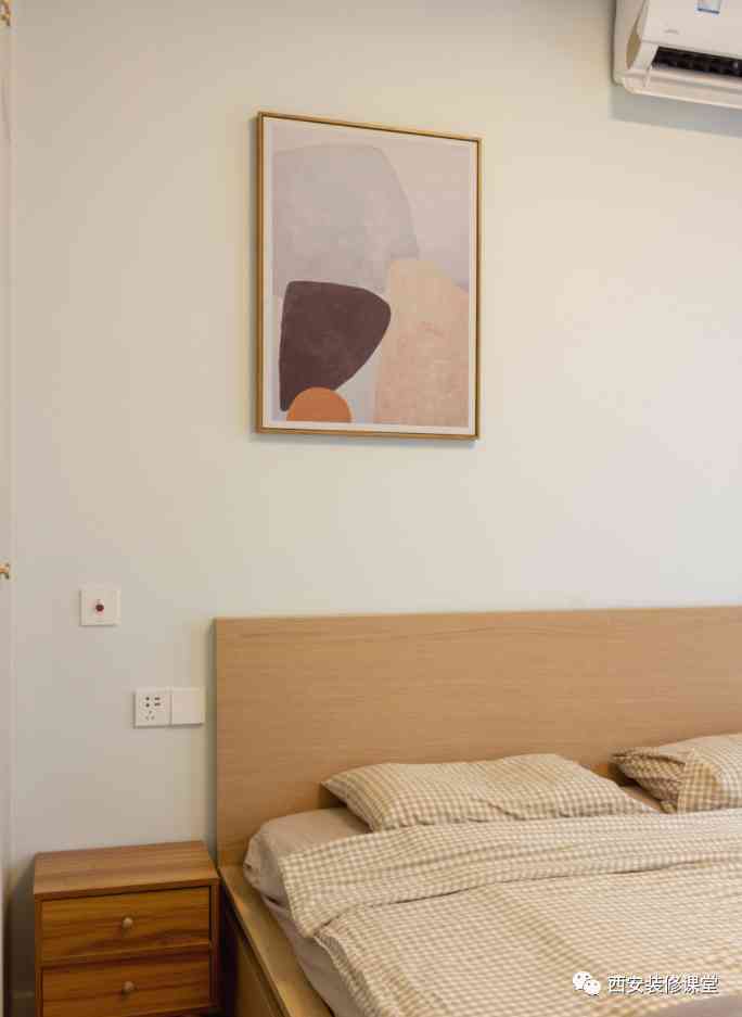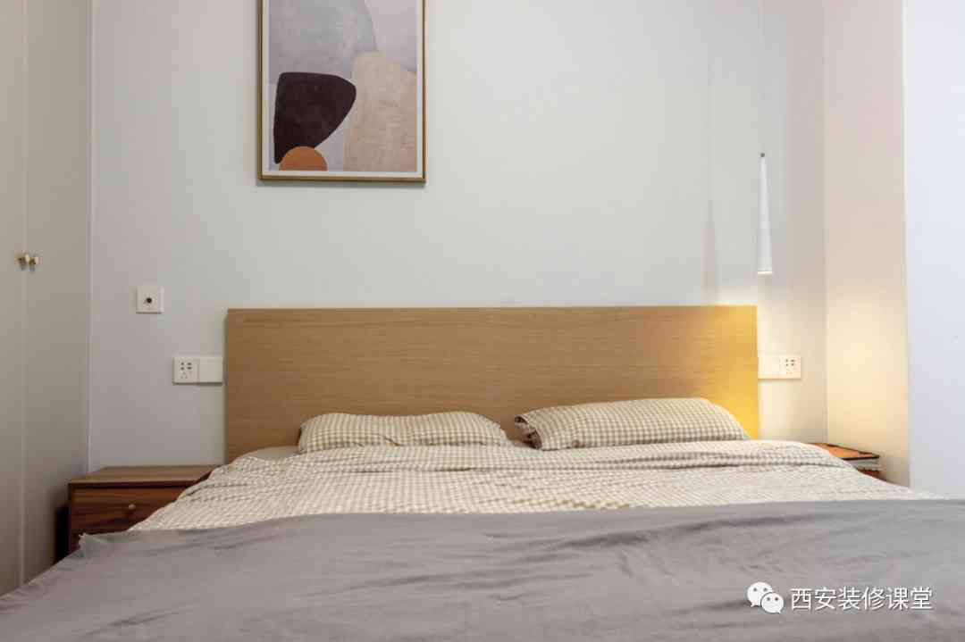 ▲主臥非常小,定制衣柜以后,剛好滿足基本家具的擺放,同樣是大白墻與木質(zhì)的純色對(duì)比。背景一副抽象掛畫錯(cuò)位布局,與吊燈同時(shí)裝點(diǎn)睡眠區(qū)的儀式感