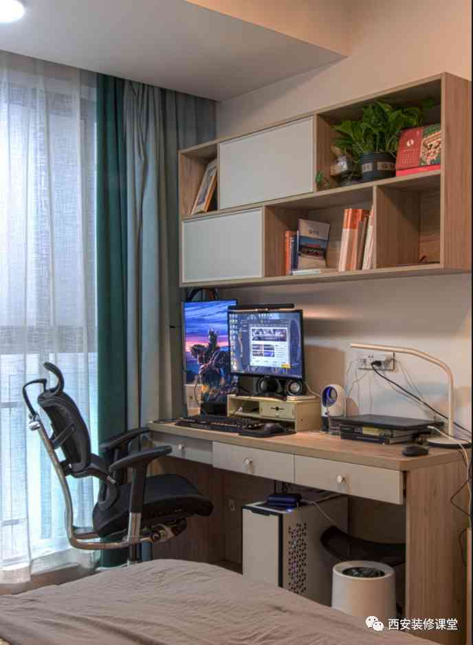 ▲主臥的床尾角落定制了書桌書柜,用來滿足平時(shí)的辦公需求