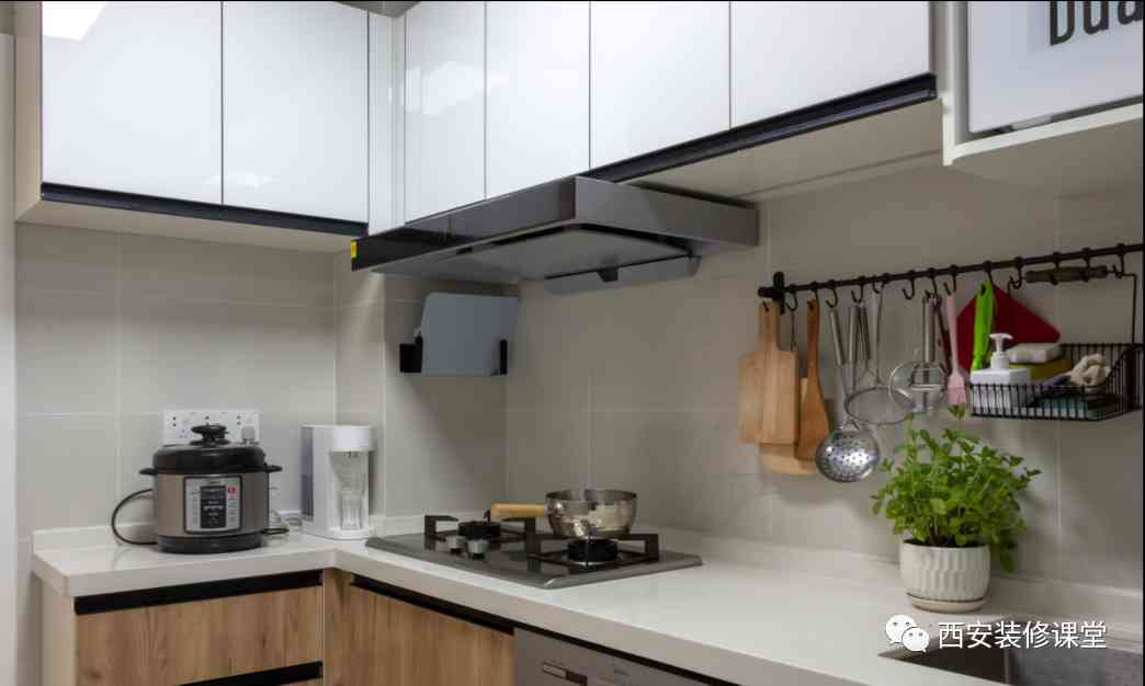 ▲L型布局,空間剛需滿足基本功能,吊柜地柜盡量多做,滿足烹飪區(qū)的更多收納