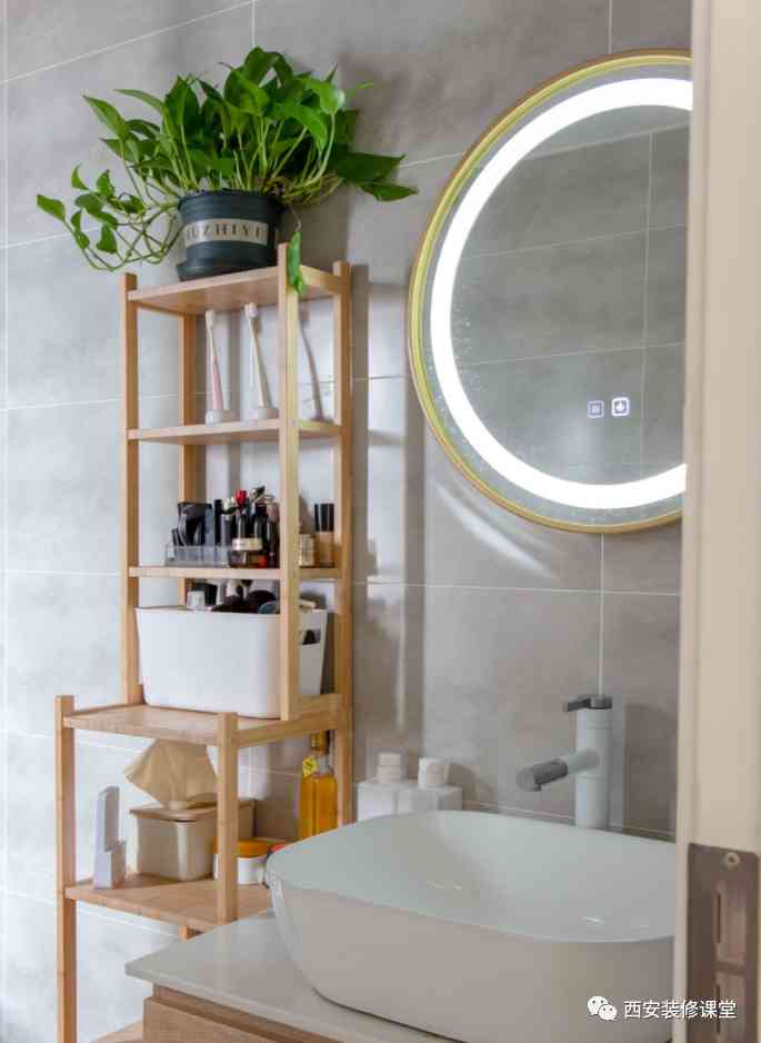 ▲衛(wèi)生間空間也很小,右手浴柜空間不大,采用臺(tái)上盆滿足功能,搭配智能鏡照明;旁邊木質(zhì)的置物架滿足一定的收納