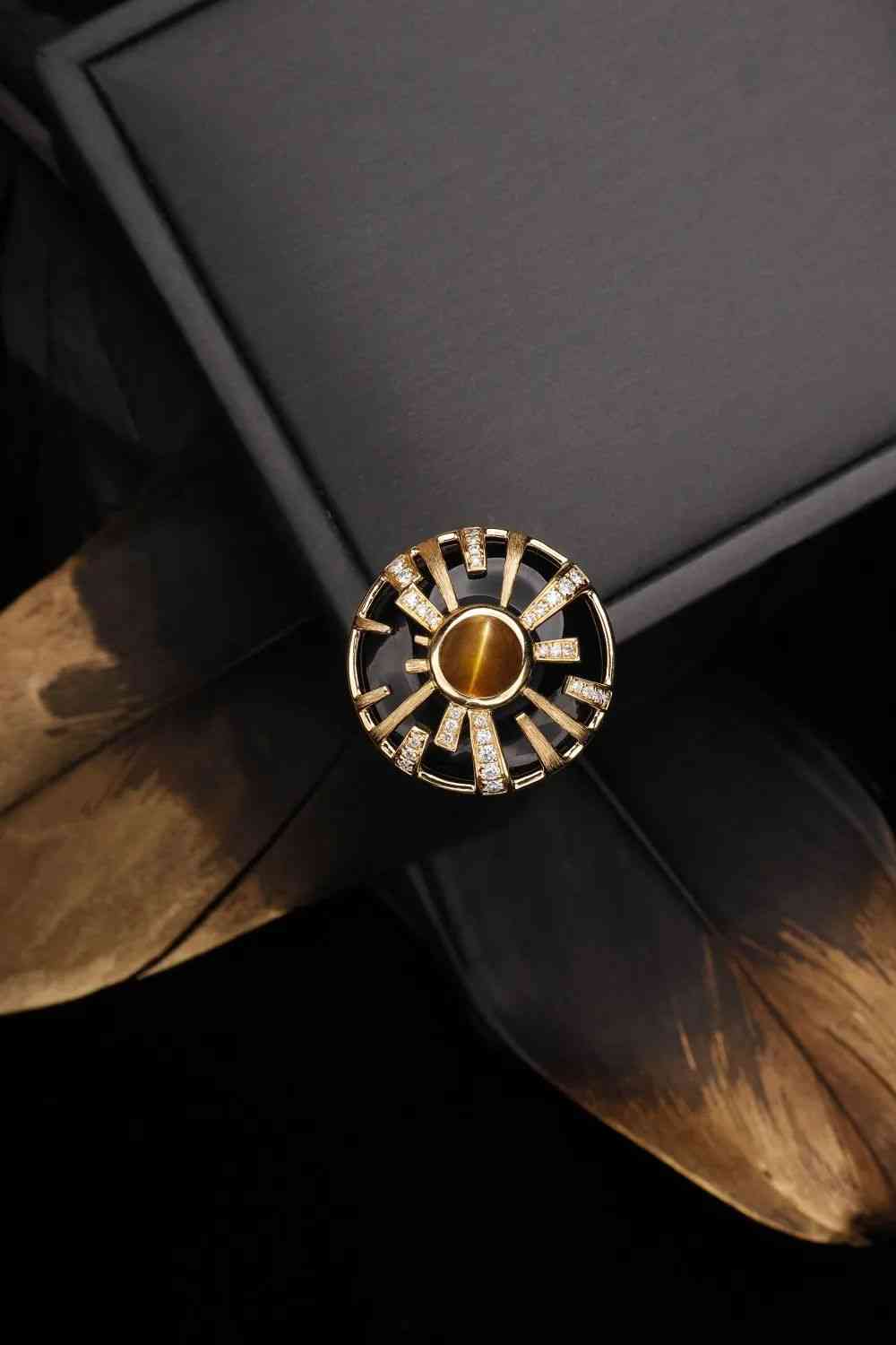 瑪瑙與貓眼的碰撞,用黃金和鉆石點(diǎn)綴,猶如從宇宙中心輻射出萬丈光芒,自帶強(qiáng)大氣場。設(shè)計(jì)靈感來源于古埃及壁畫上的太陽,色彩組合又會讓人聯(lián)想到優(yōu)雅神秘的波斯貓,想象一只傲嬌慵懶的波斯貓匍匐于你的手指尖,高貴氣質(zhì)噴涌而出。