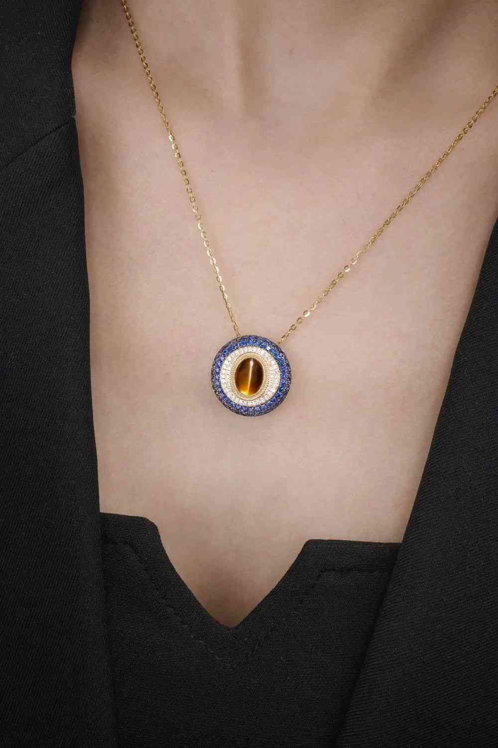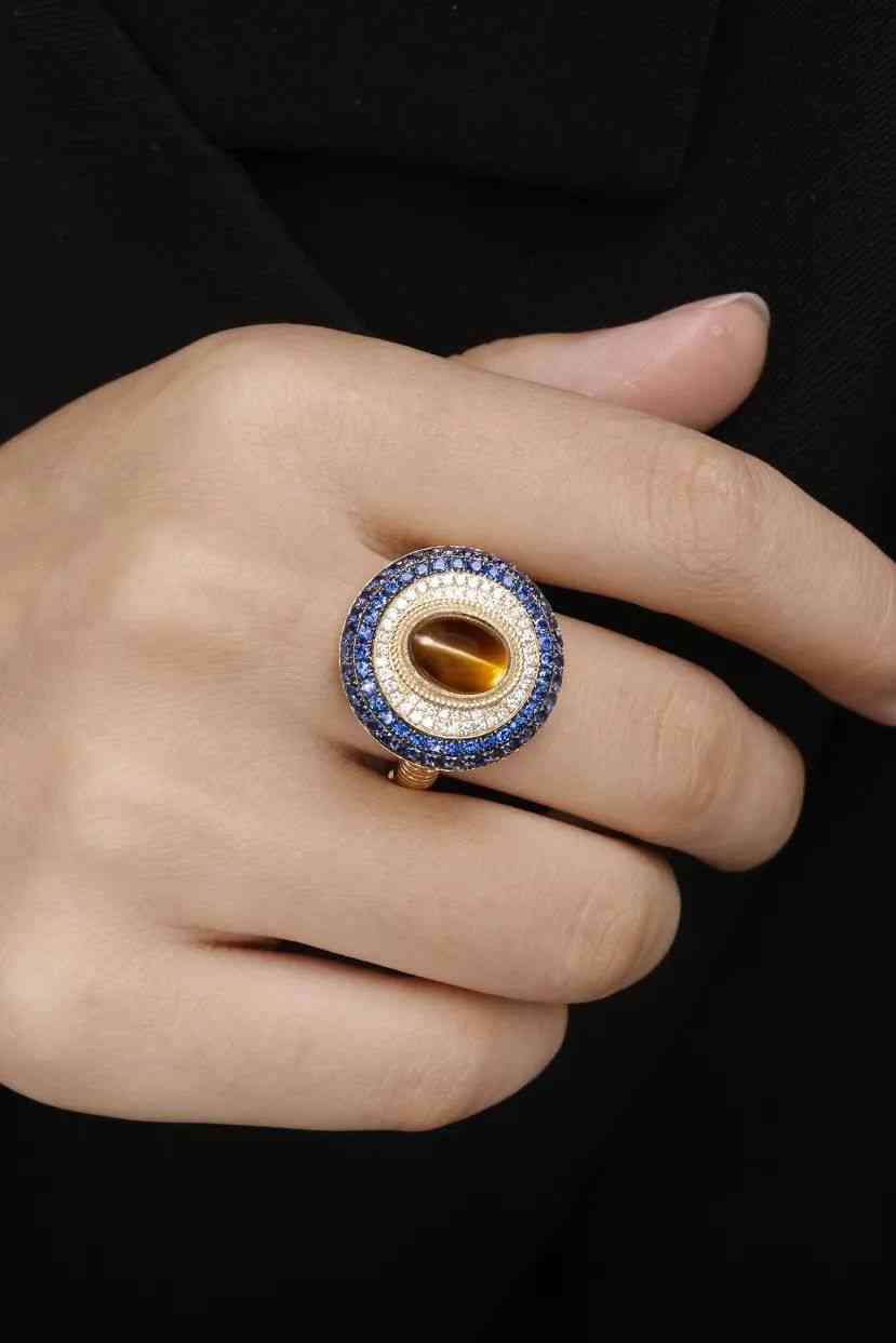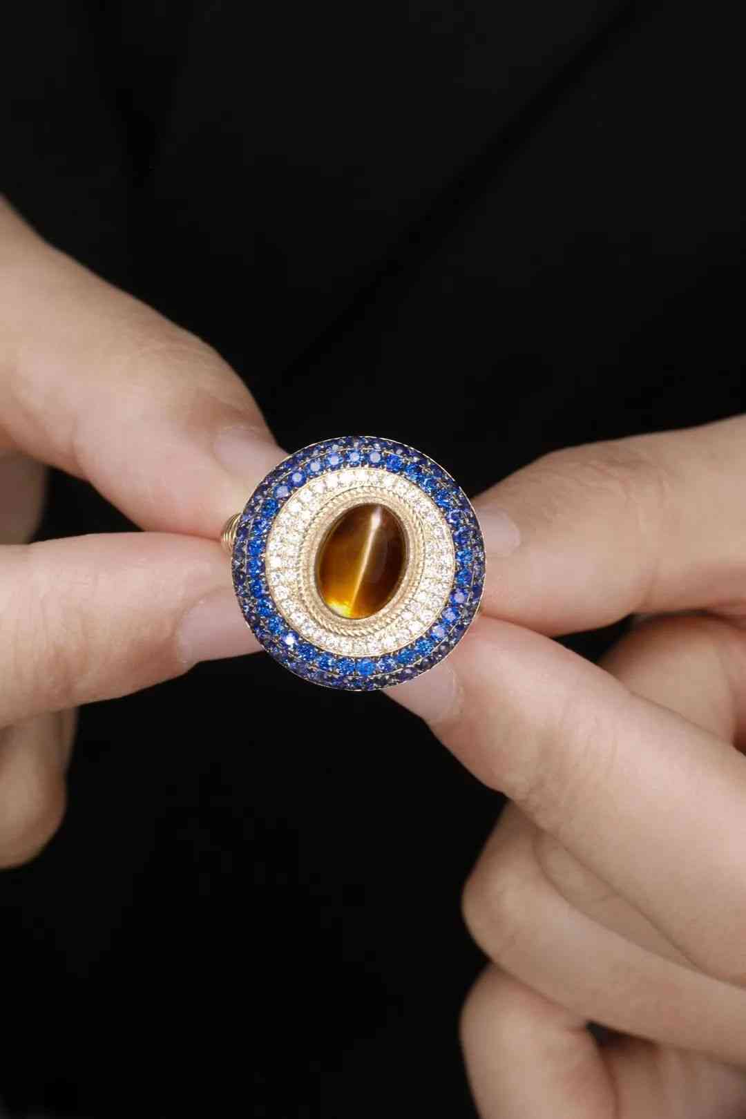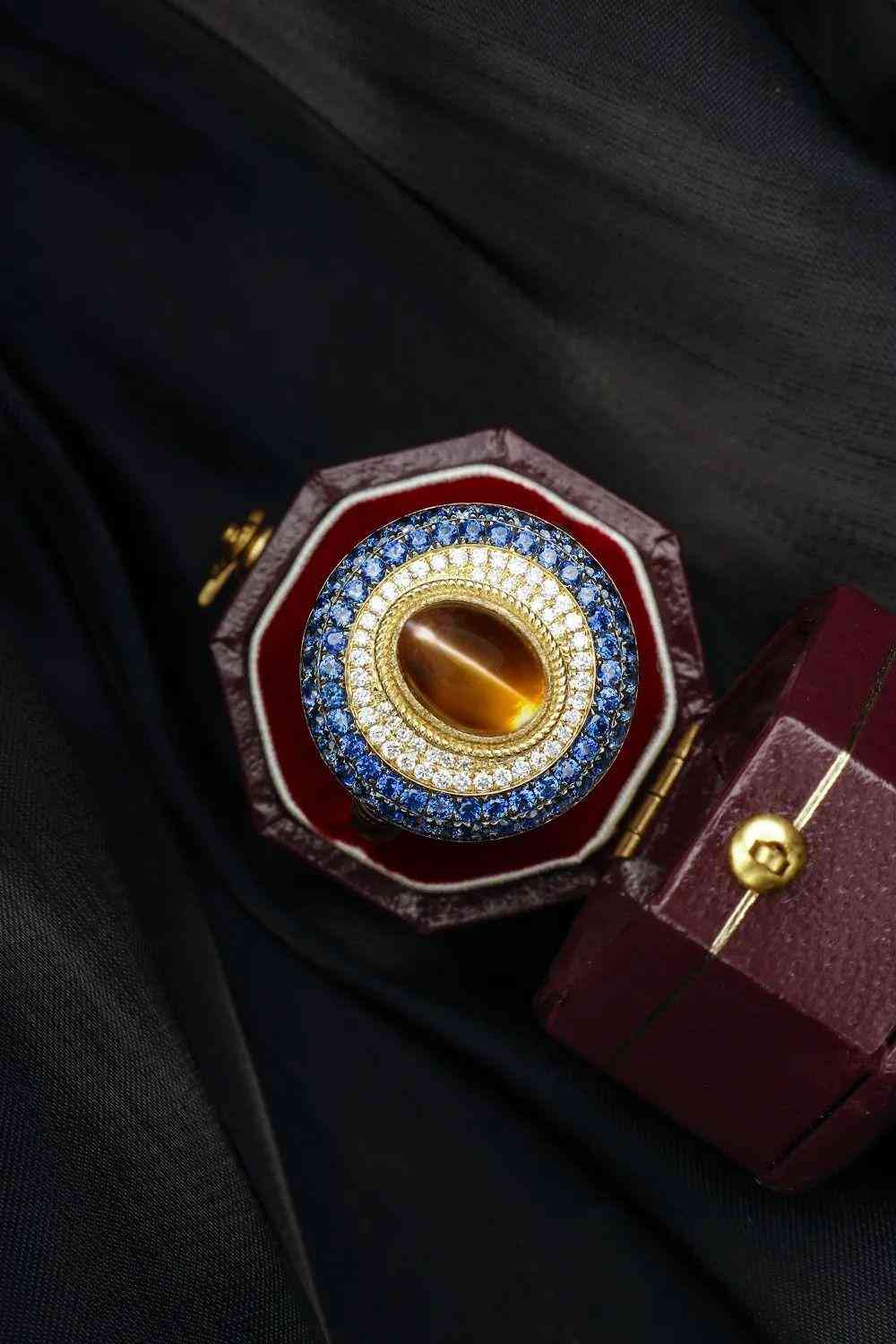 藍(lán)寶石與貓眼的碰撞,仿佛是藍(lán)色夜空里的一輪明月,藍(lán)絲絨上的一滴眼淚。層層圍鑲,層層遞進(jìn),視覺焦點(diǎn)都被集中到了貓眼石上,充滿吸引力。