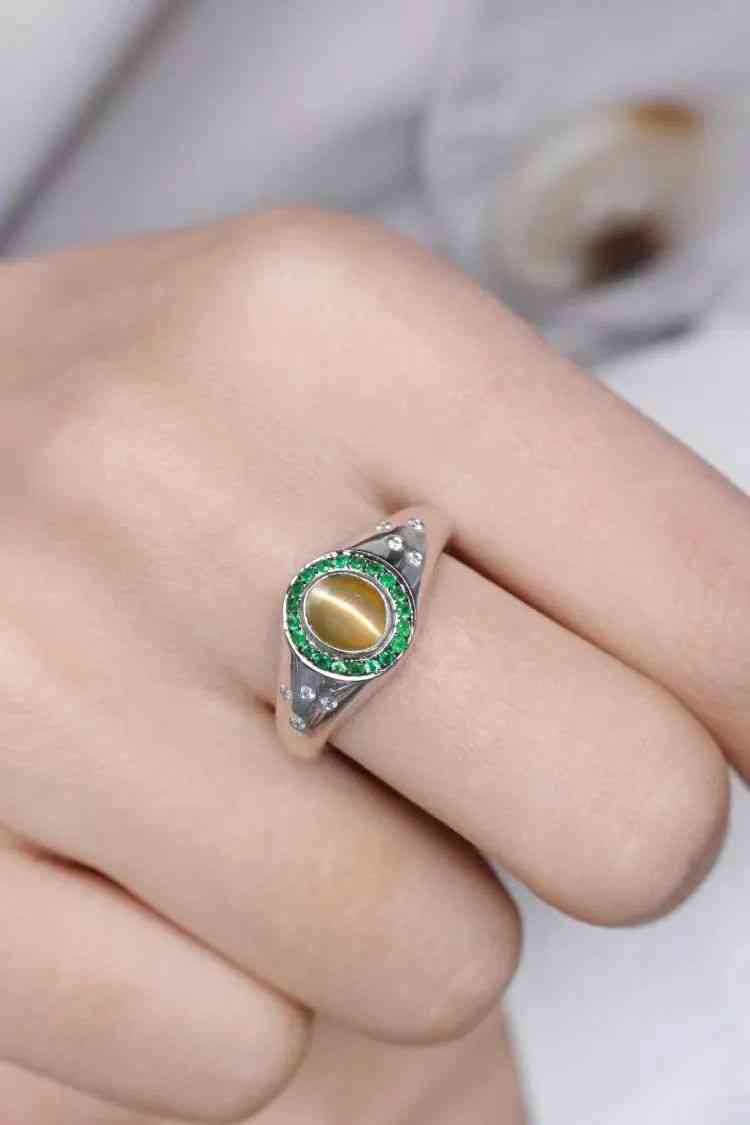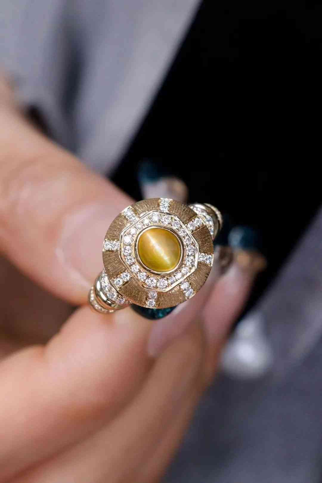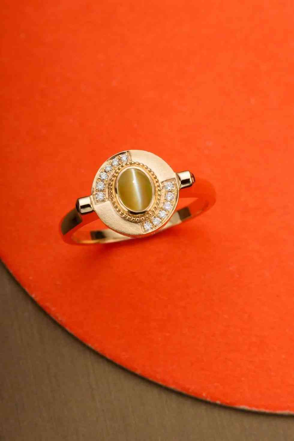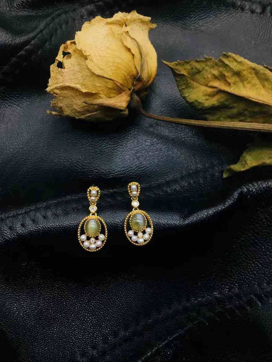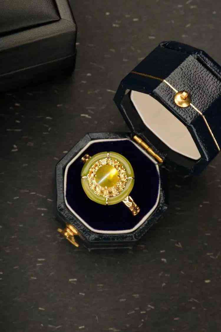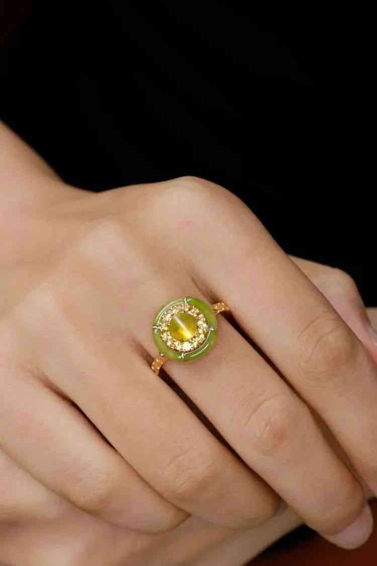 貓眼其實(shí)屬于“金綠玉”的一種,加上蛋面切割的溫柔弧線,和同樣色調(diào)質(zhì)感的黃綠色玉髓營造出了不一樣的氛圍感,溫潤閃亮,古典雅致。