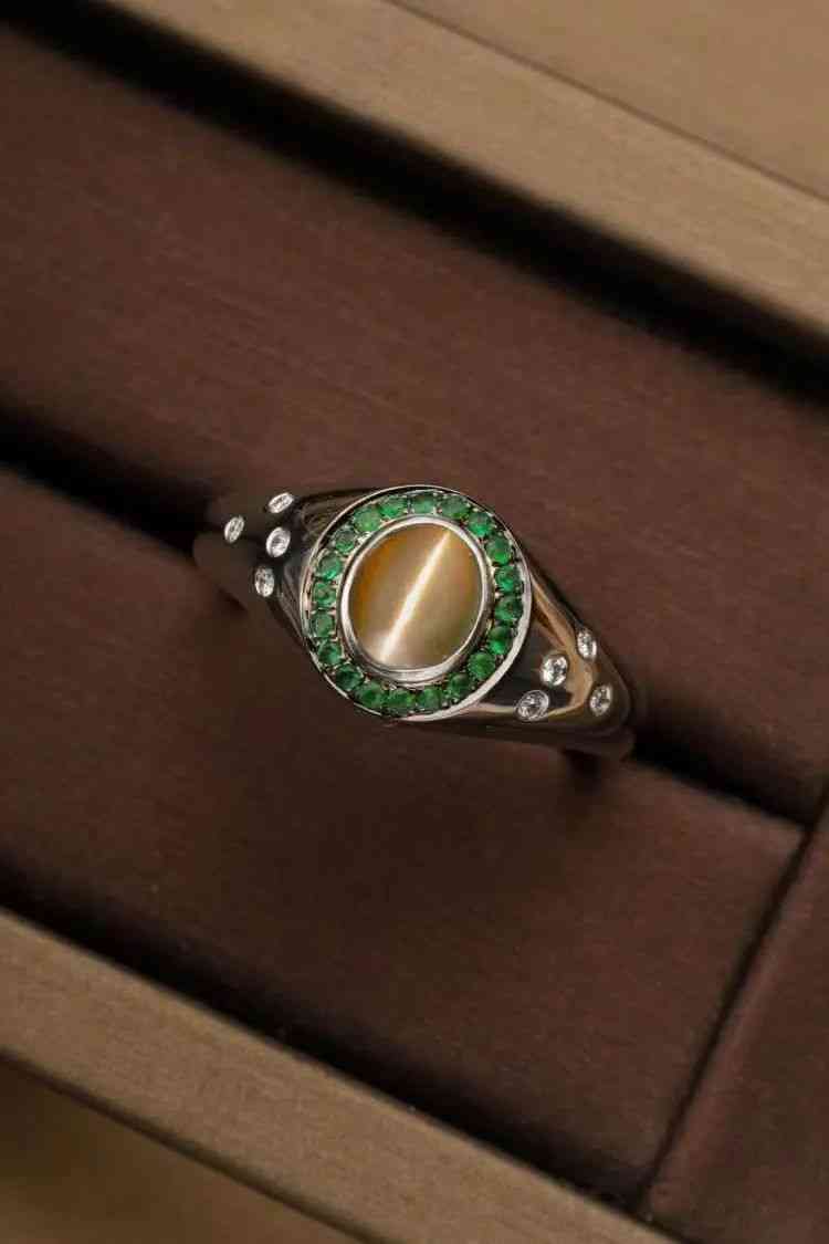綠色沙弗萊與金色貓眼搭配,靈動活潑,充滿青春朝氣。兩三鉆石點(diǎn)綴,隨性自然。