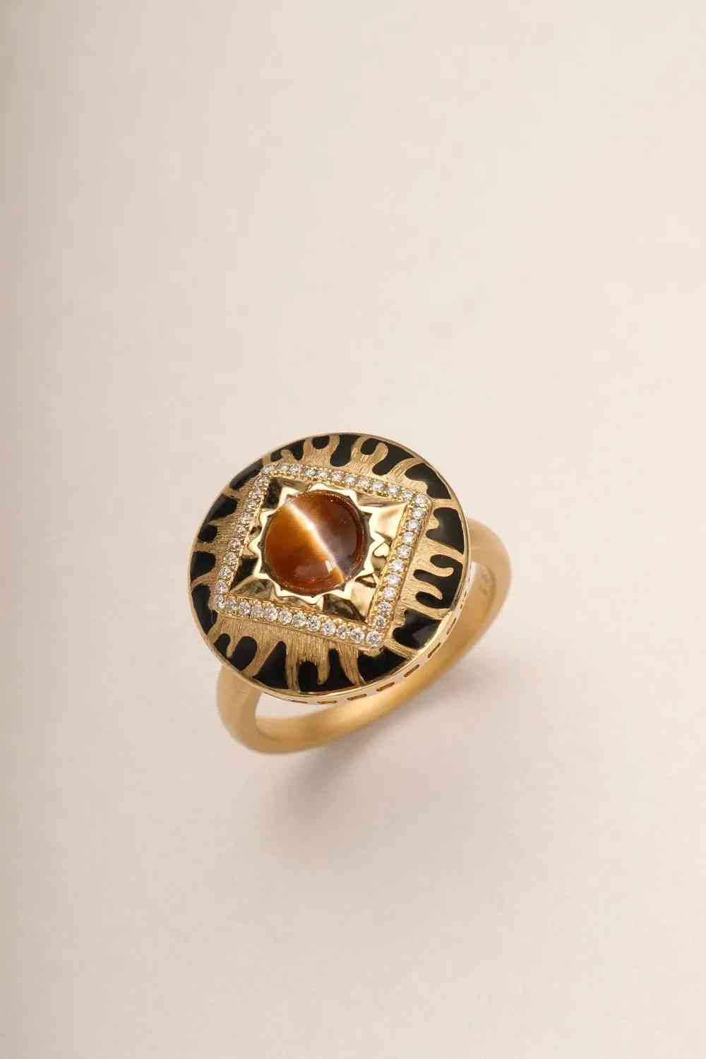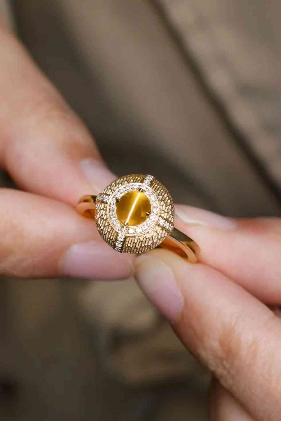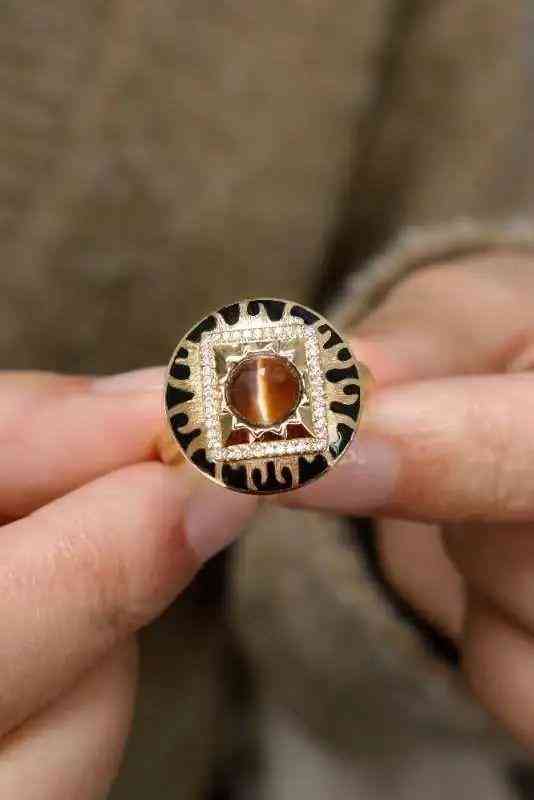 整個戒指的花頭可以旋轉(zhuǎn),佩戴充滿趣味性!鎏金火焰紋,焦糖色貓眼搭配,別具一格。