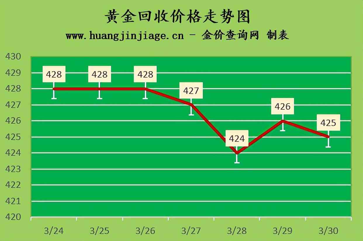 黃金回收價(jià)格425元/克,鉑金回收價(jià)格189元/克,鈀金回收價(jià)格290元/克,18K金回收價(jià)格303元/克,銀條回收價(jià)格4元/克。(黃金行情是波動(dòng)的,回收金價(jià)沒(méi)有固定標(biāo)準(zhǔn)。)