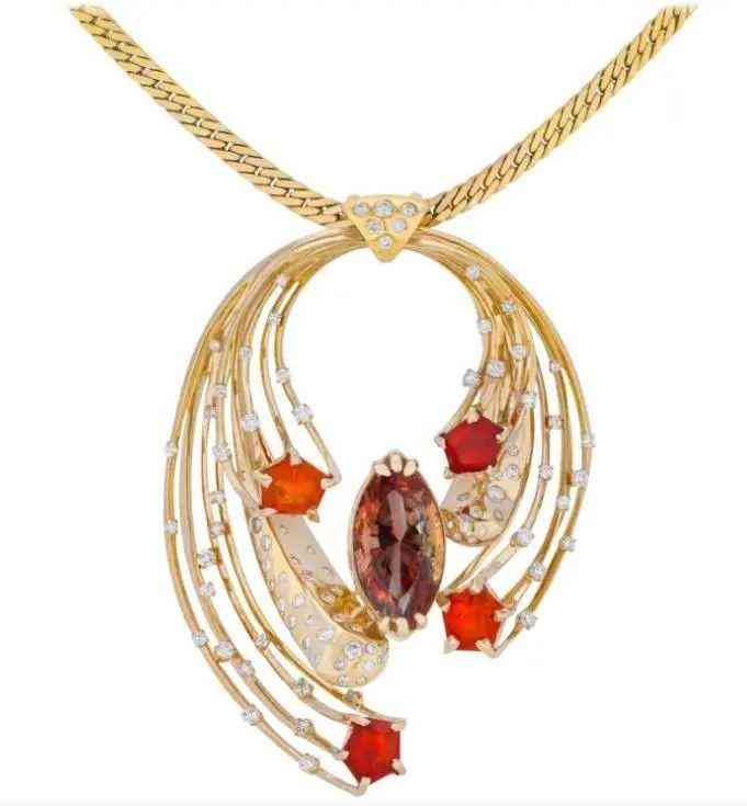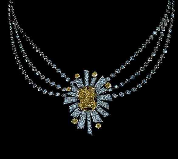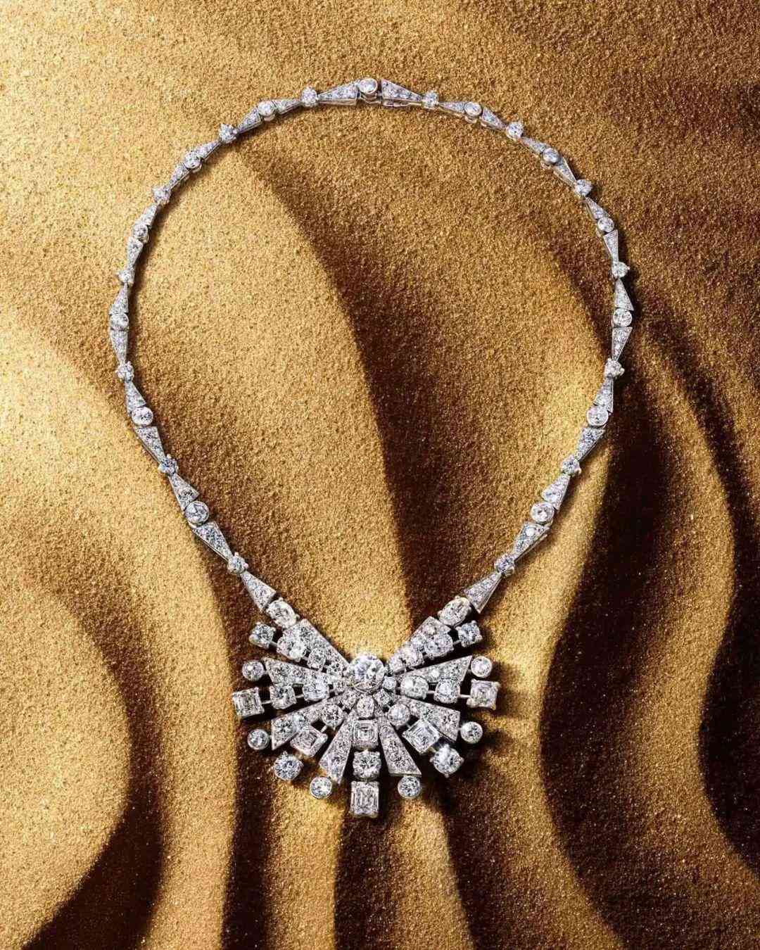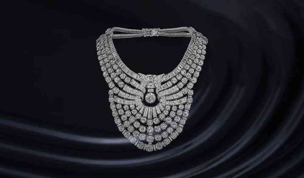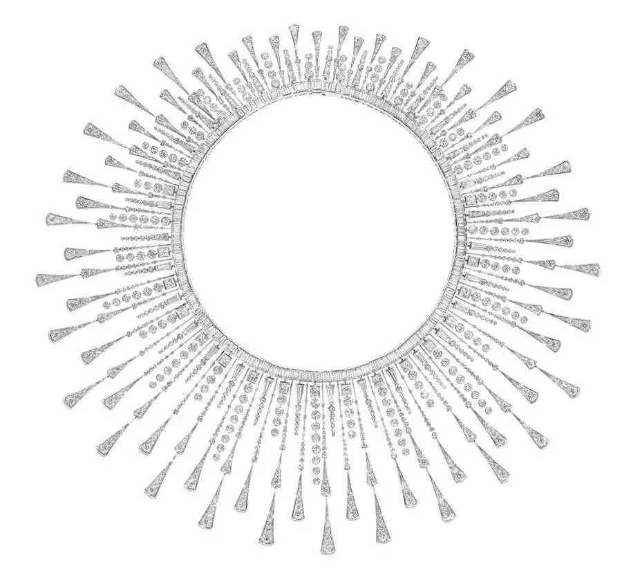 埃及王后納絲莉(Queen Nazli of Egypt)在女兒法齊亞公主舉行婚禮前委托梵克雅寶制作了一條以太陽(yáng)為主題的圍兜項(xiàng)鏈,鑲嵌了 600 顆重近 300 克拉的鉆石項(xiàng)鏈,帶有明顯的 Art Deco 風(fēng)格,當(dāng)然,這個(gè)風(fēng)格本身就受埃及文化影響,酷愛(ài)以輻射線(xiàn)條來(lái)表達(dá)陽(yáng)光照耀的光輝。