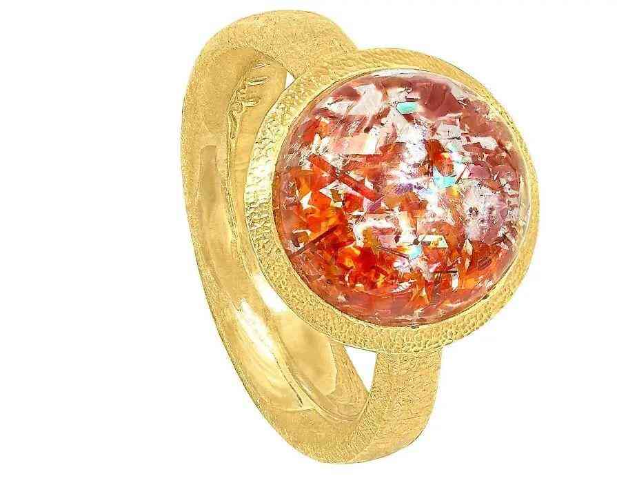 日光石擁有和太陽(yáng)相同的色調(diào)——各種深淺不一的紅色、棕色和橙色,對(duì)大部分寶石來(lái)說(shuō),凈度越高越好,但日光石則是一個(gè)例外,它的內(nèi)含物才是它的特別之處,這些閃閃發(fā)光的雜質(zhì)會(huì)讓寶石擁有一種鍍金效果,像極了金色的陽(yáng)光。石頭看起來(lái)很有吸引力并具有鍍金效果。