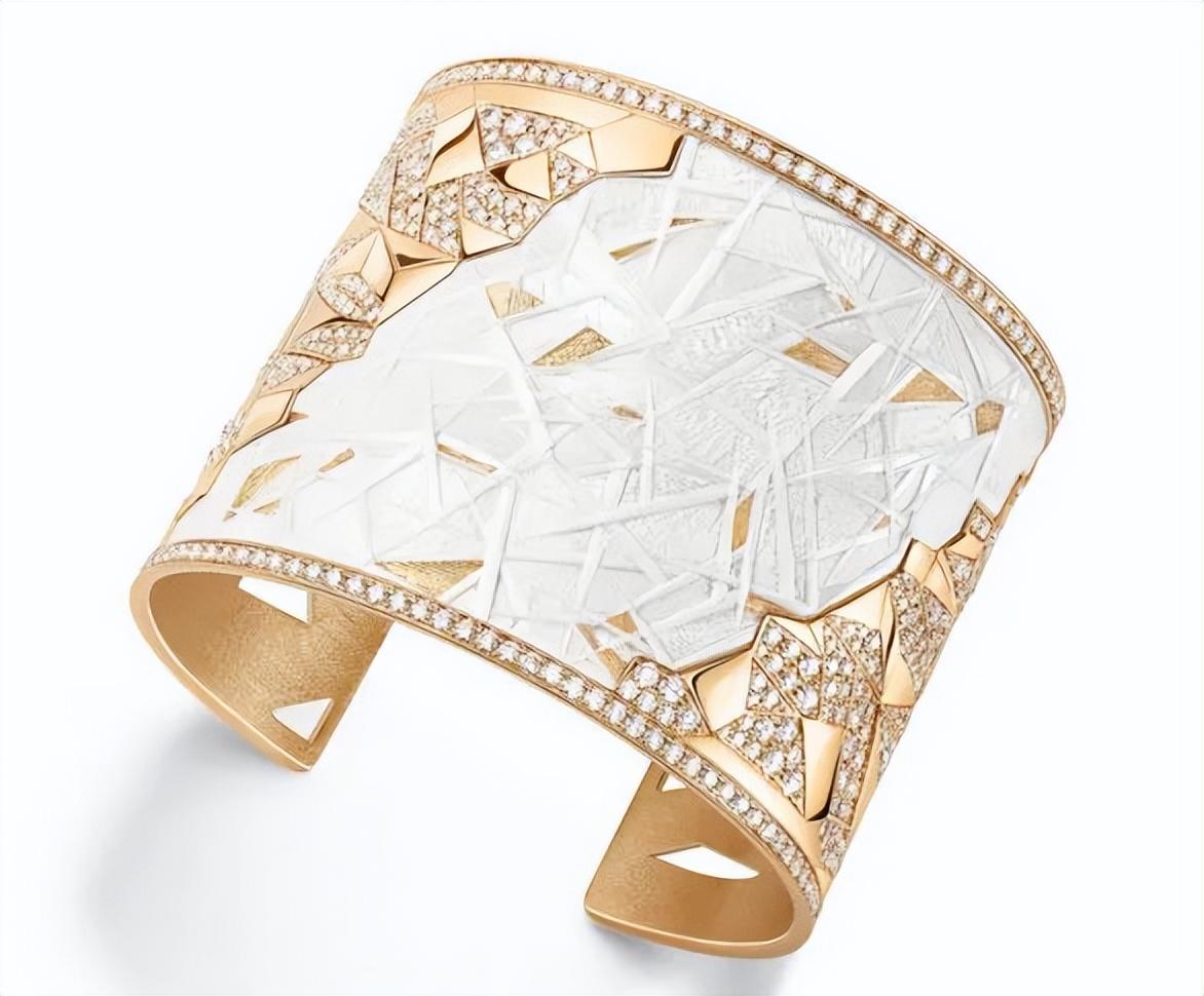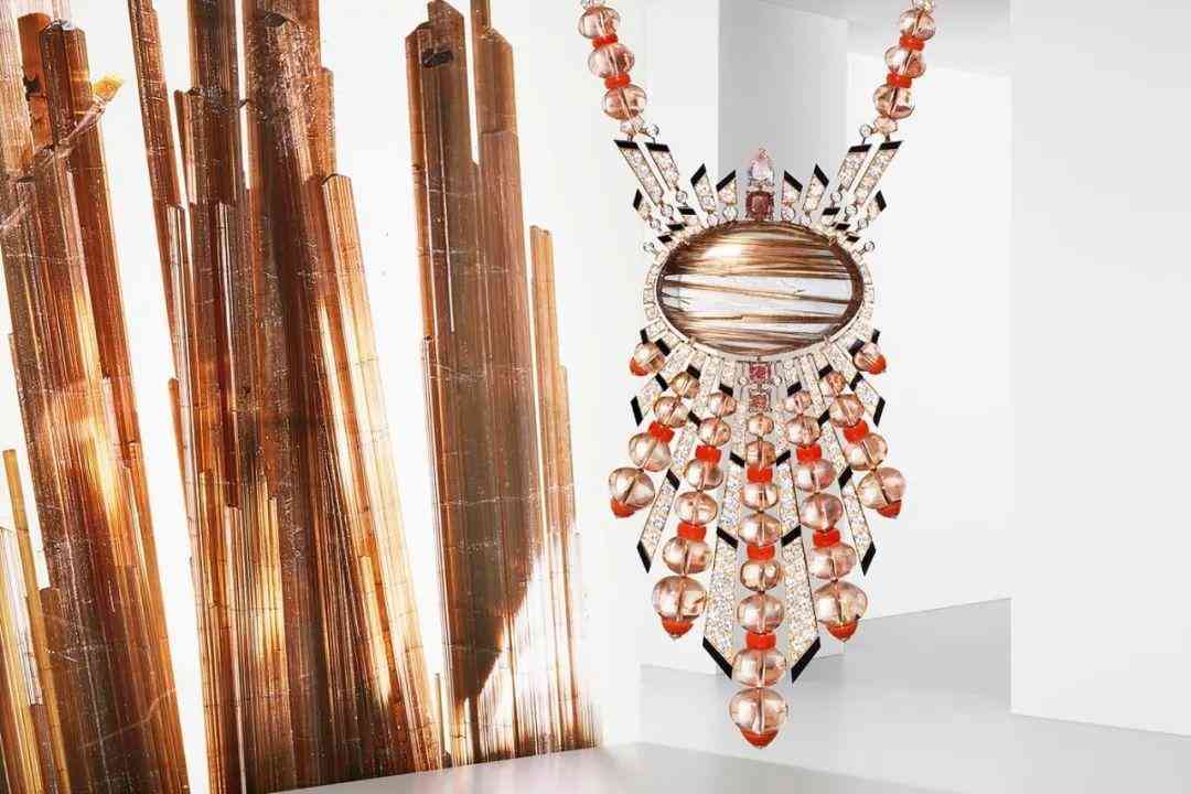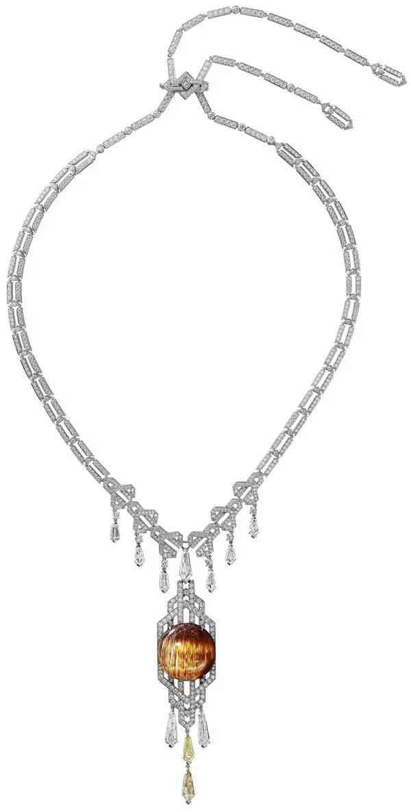透明的發(fā)晶加上內(nèi)部縱橫交錯(cuò)的金紅石包體,是不是很像太陽(yáng)發(fā)出的光芒?卡地亞就曾以發(fā)晶為主石推出過(guò)以太陽(yáng)為主題的高級(jí)珠寶設(shè)計(jì),比如 'Aphélie' 項(xiàng)鏈,它以玫瑰金制成,主石為一顆重達(dá) 68.85 克拉的凸圓形發(fā)晶,獨(dú)特的紋路和周?chē)奶?yáng)紋圖案彼此呼應(yīng)。