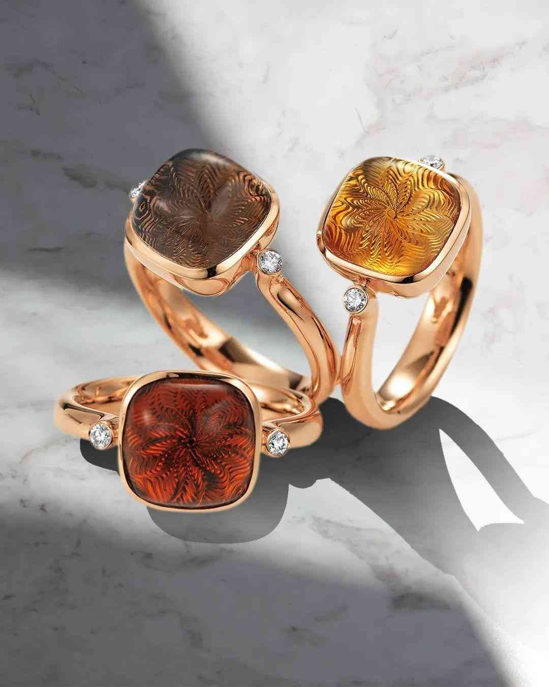 錳鋁榴石明亮的的橙紅色給人溫暖的感覺(jué),也會(huì)被用來(lái)代表熱烈的太陽(yáng),比如卡地亞 étourdissant 錳鋁榴石戒指,靈感來(lái)自日落時(shí)的海灘,用錳鋁榴石代表海灘沿岸溫暖的夕陽(yáng)。