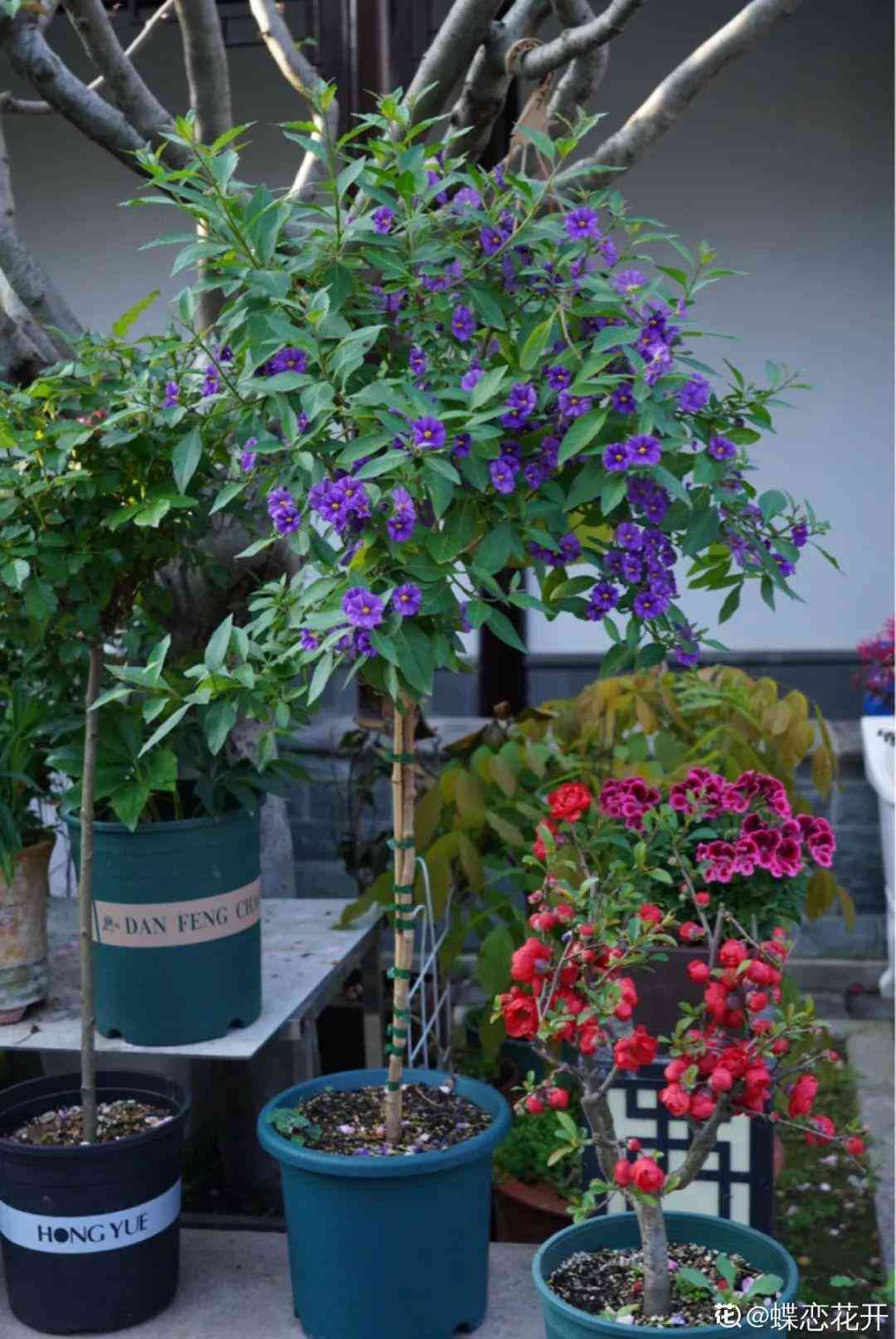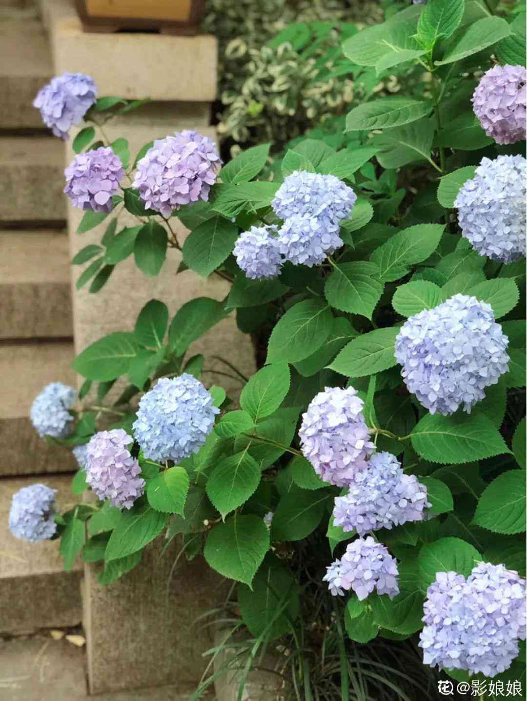 夏天炎熱時節(jié),盆栽的藍(lán)雪花、茉莉、繡球,