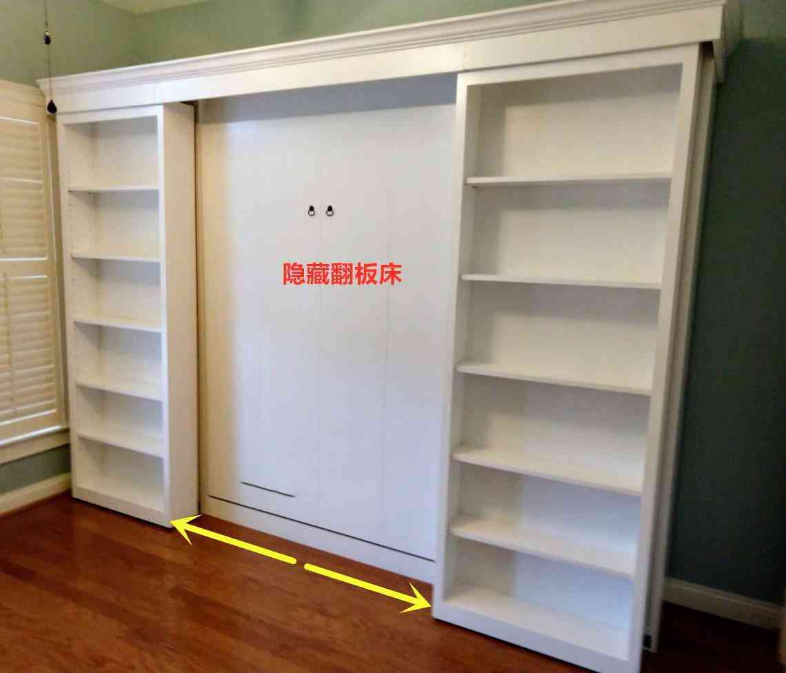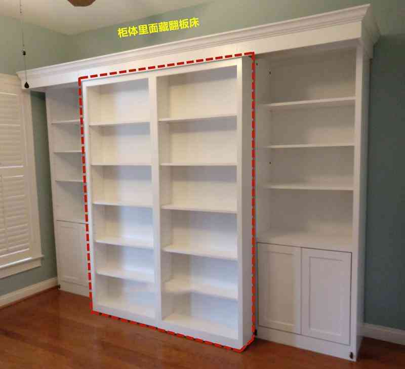 原理就是先靠墻做翻板床,然后再做收納柜體,將翻板床完全覆蓋、隱藏住,從占面積上來看,這種是常見的隱藏翻板床的2倍,更占空間一些。